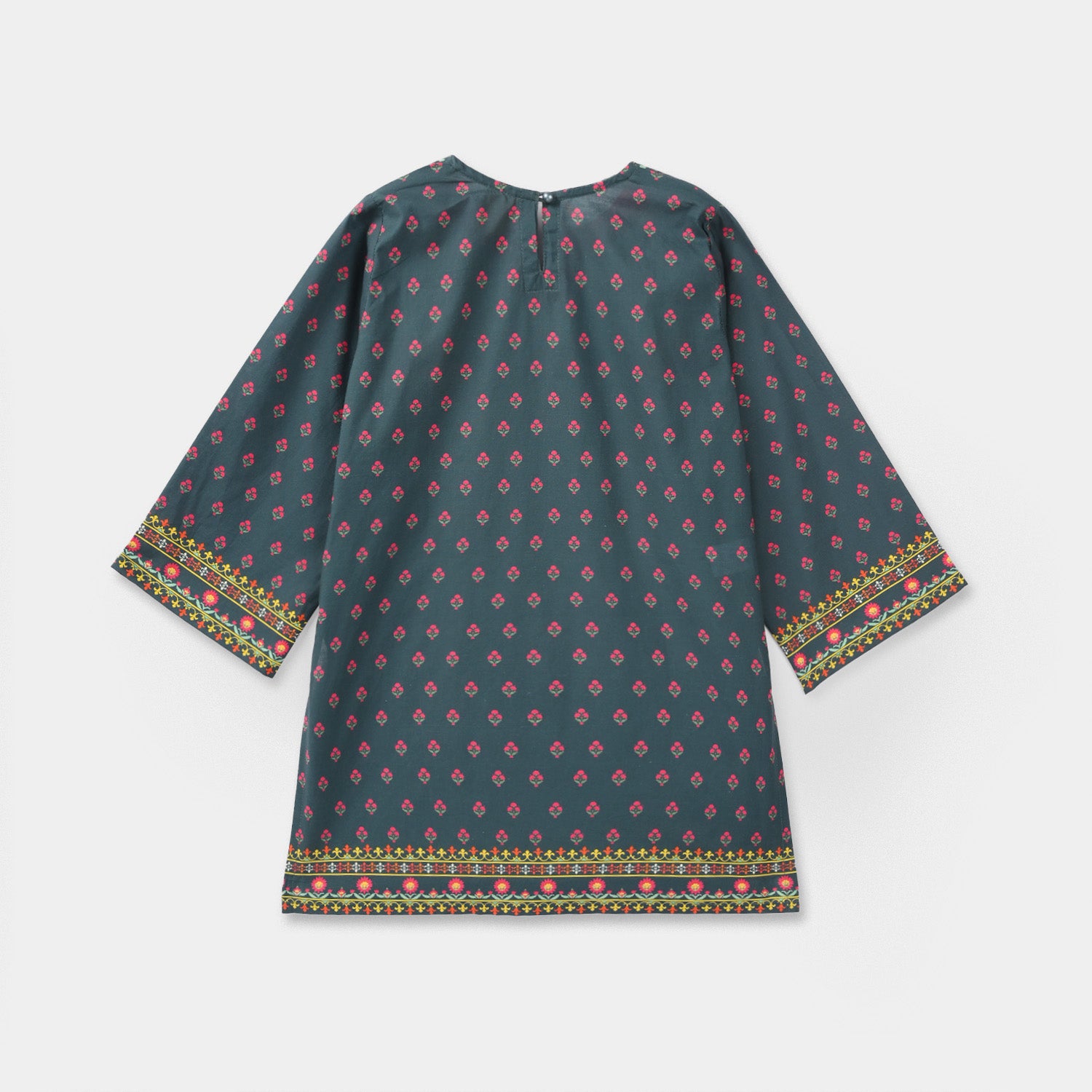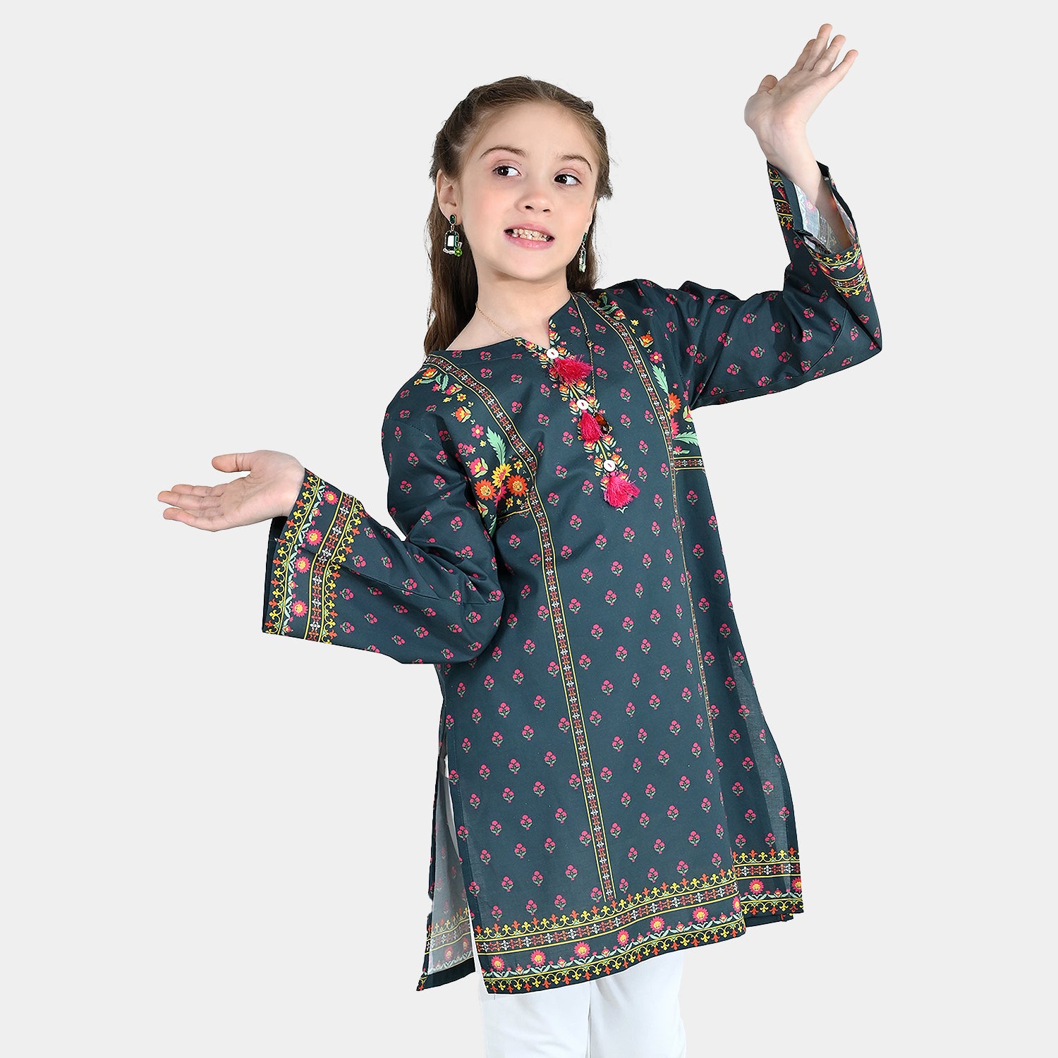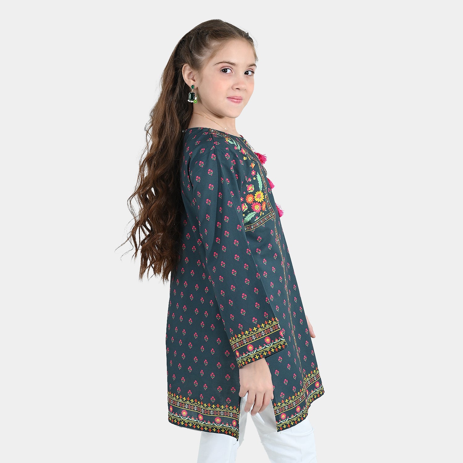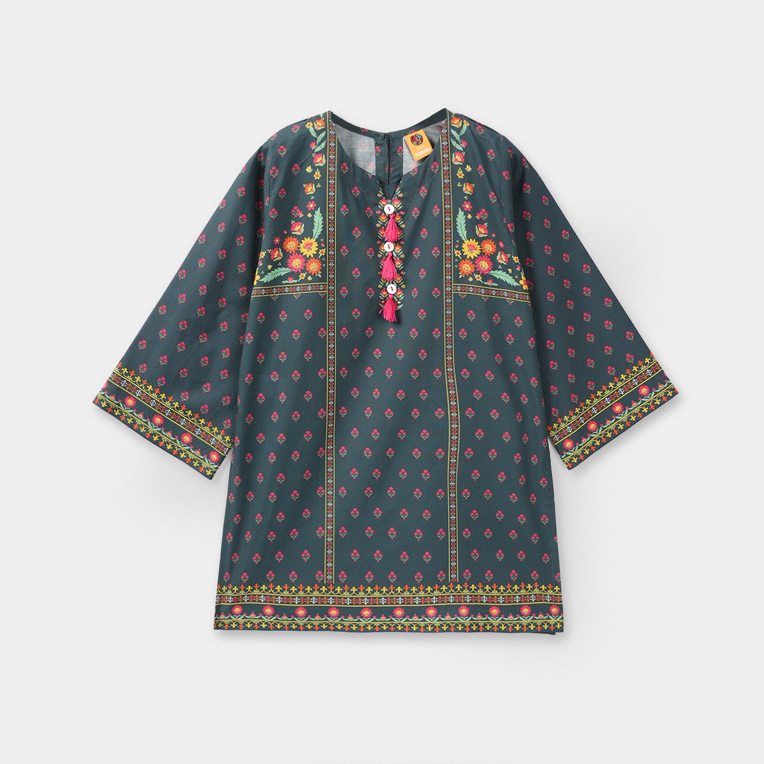 Girls’ cotton printed kurti Eira in teal blue, featuring tassel neck detailing, full sleeves, and a straight-cut fit.