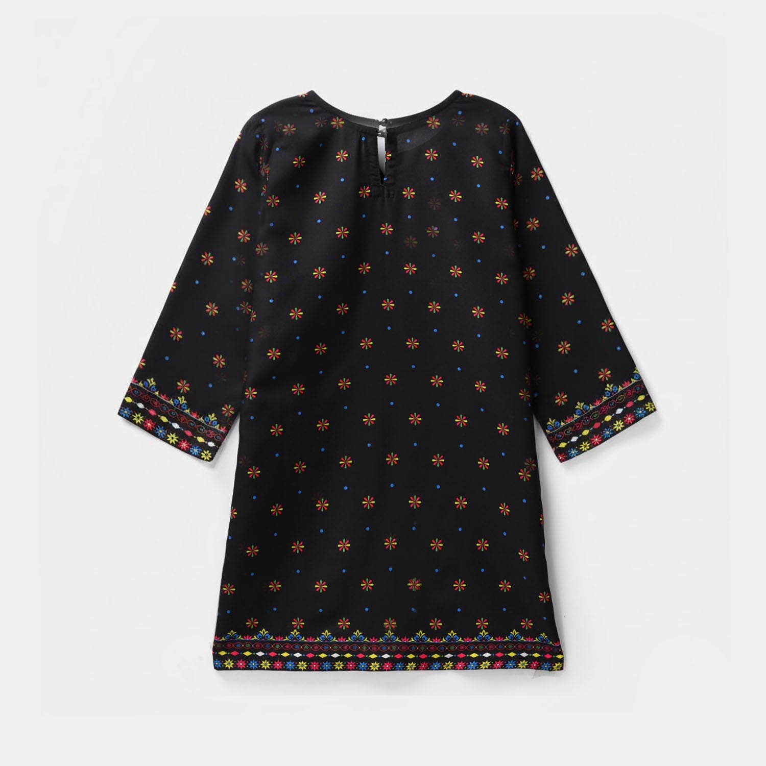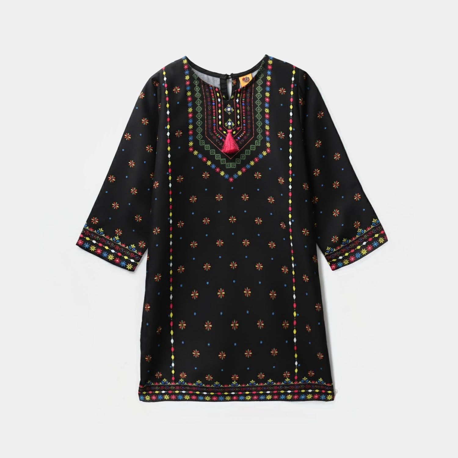 This black printed girls kurti in poly satin features a round neck with pearls and tassel detailing, full sleeves, and a straight fit and can be paired with any bottom.