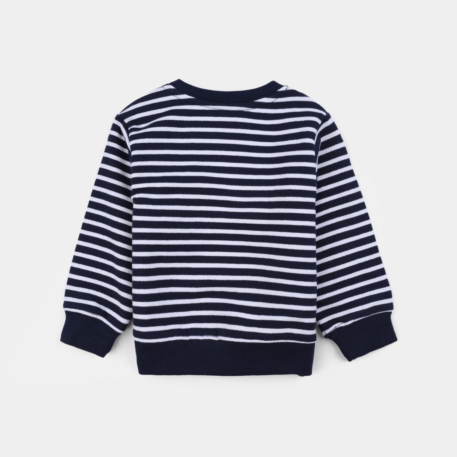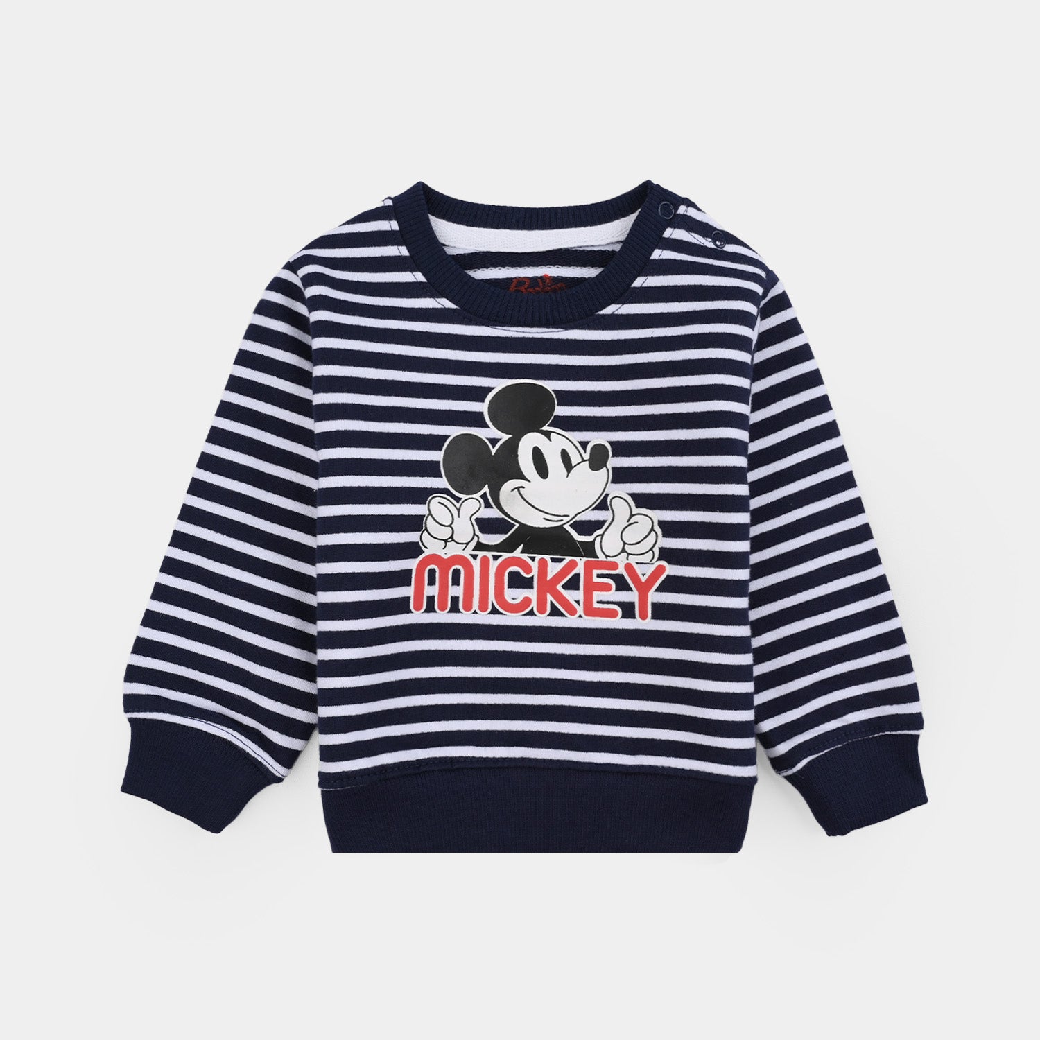 Boys Jersey/Terry Sweatshirt in Navy featuring white lining patterns and a Mickey Mouse embroidery on the front. Designed with a round neck, full sleeves, and a hem finish. Perfect to pair with any pants or trousers for a cozy, casual look.