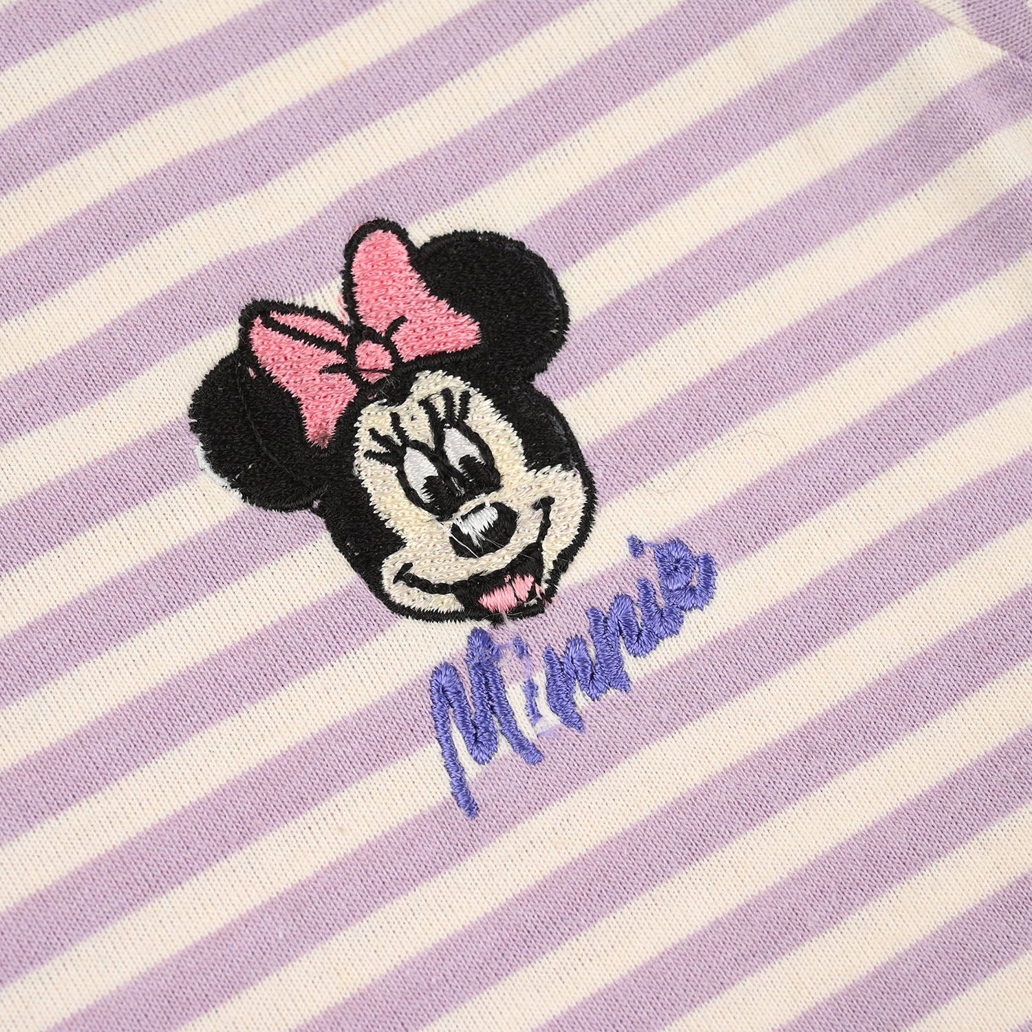 Infant girls' pastel lilac and white poly-cotton jersey night suit featuring a round neck, half sleeves, a striped pattern, and a Minnie Mouse print, perfect for a cozy and comfortable everyday sleep.