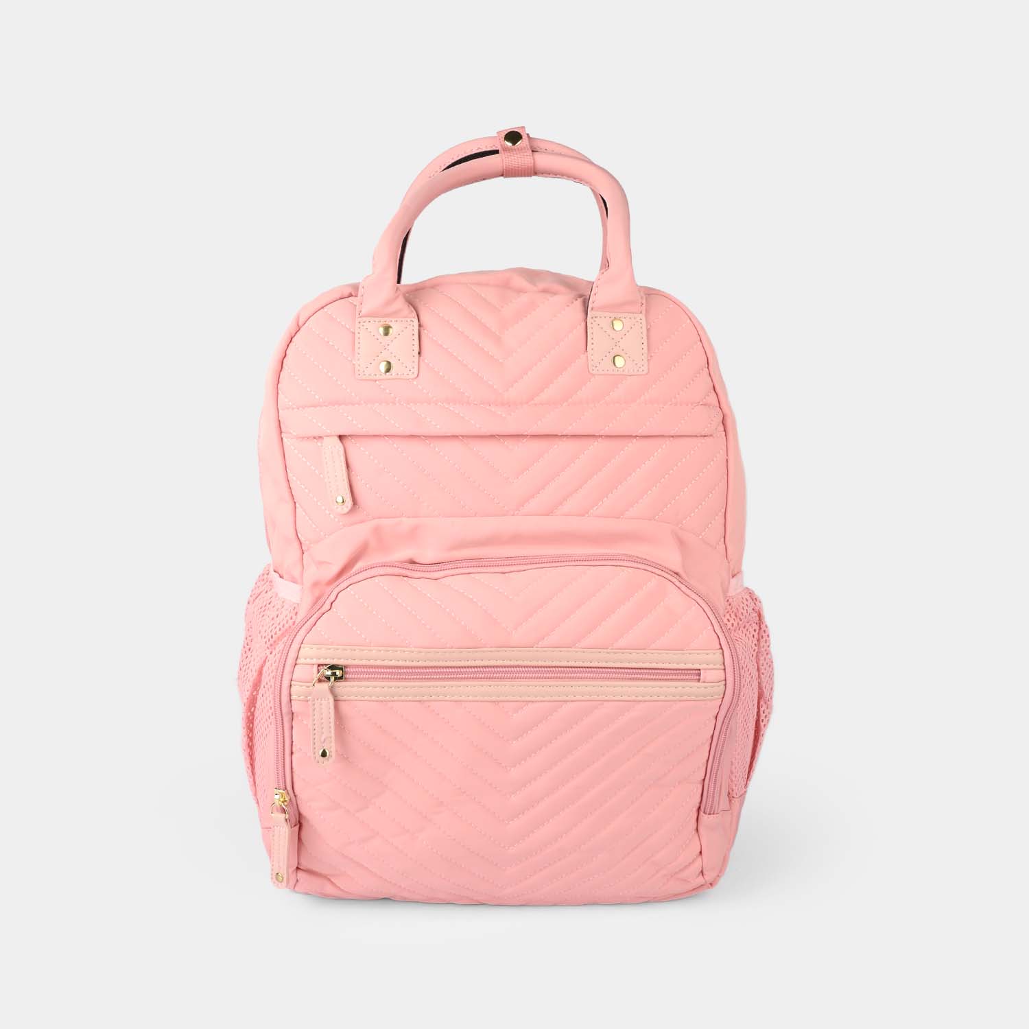 This stylish baby backpack in soft blush pink features chevron quilting for an elegant look, providing convenient hands-free use for parents on the go.