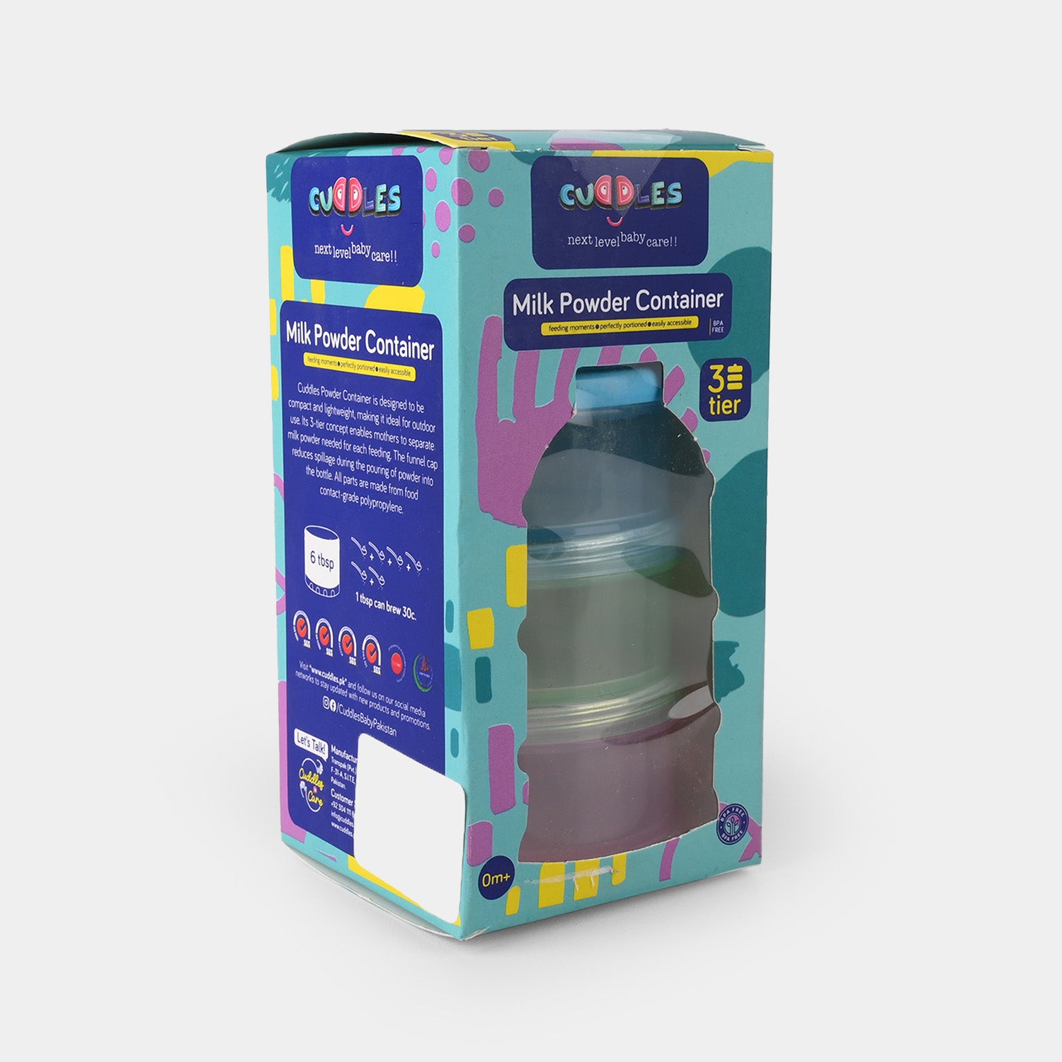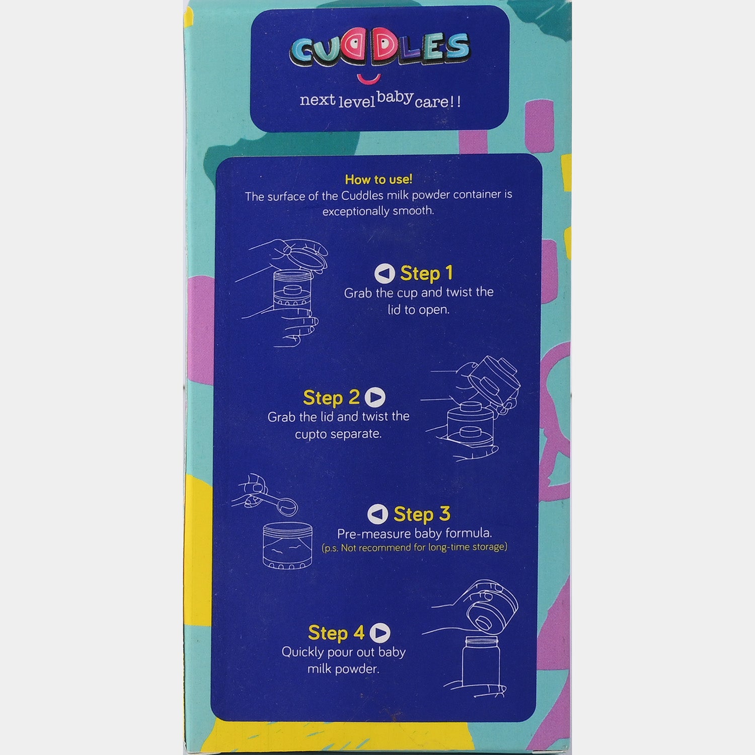 Cuddles powder container is designed to be compact and lightweight. Its 3 tier concept enables mothers to separate milk powder needed for each feeding session. The funnel cap reduces spillage during the pouring of powder into the bottle. All parts are made from food contact-grade.