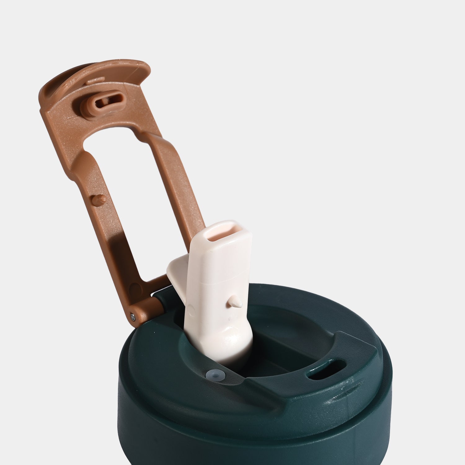 This stainless steel coffee mug features a sleek dark green body with a brown flip lid and secure grip handle, perfect for keeping drinks hot or cold while on the go. |