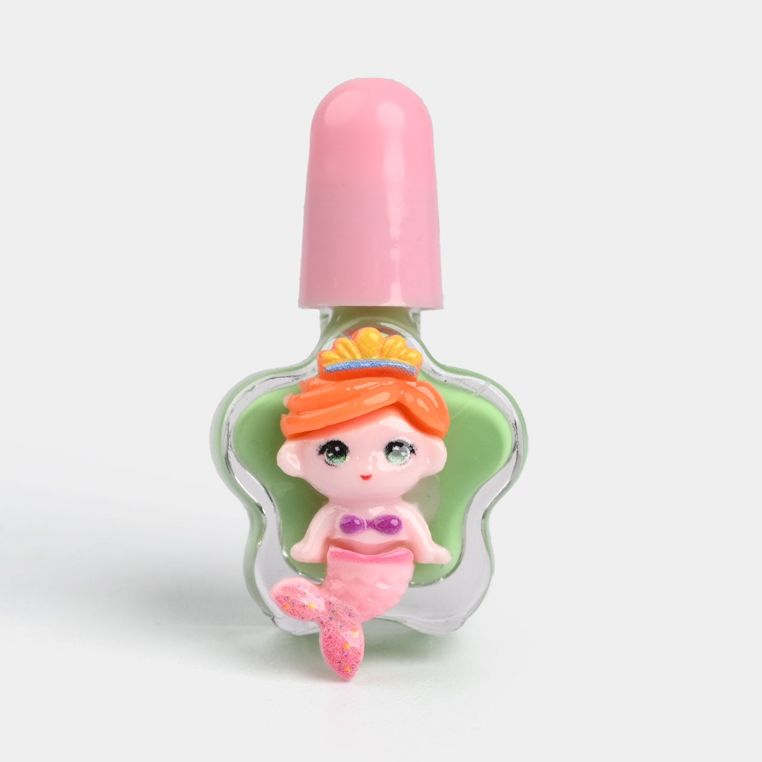 Add a touch of fun to your collection with this sparkling green mermaid-themed nail polish in a cute bottle, topped with a soft pink cap.