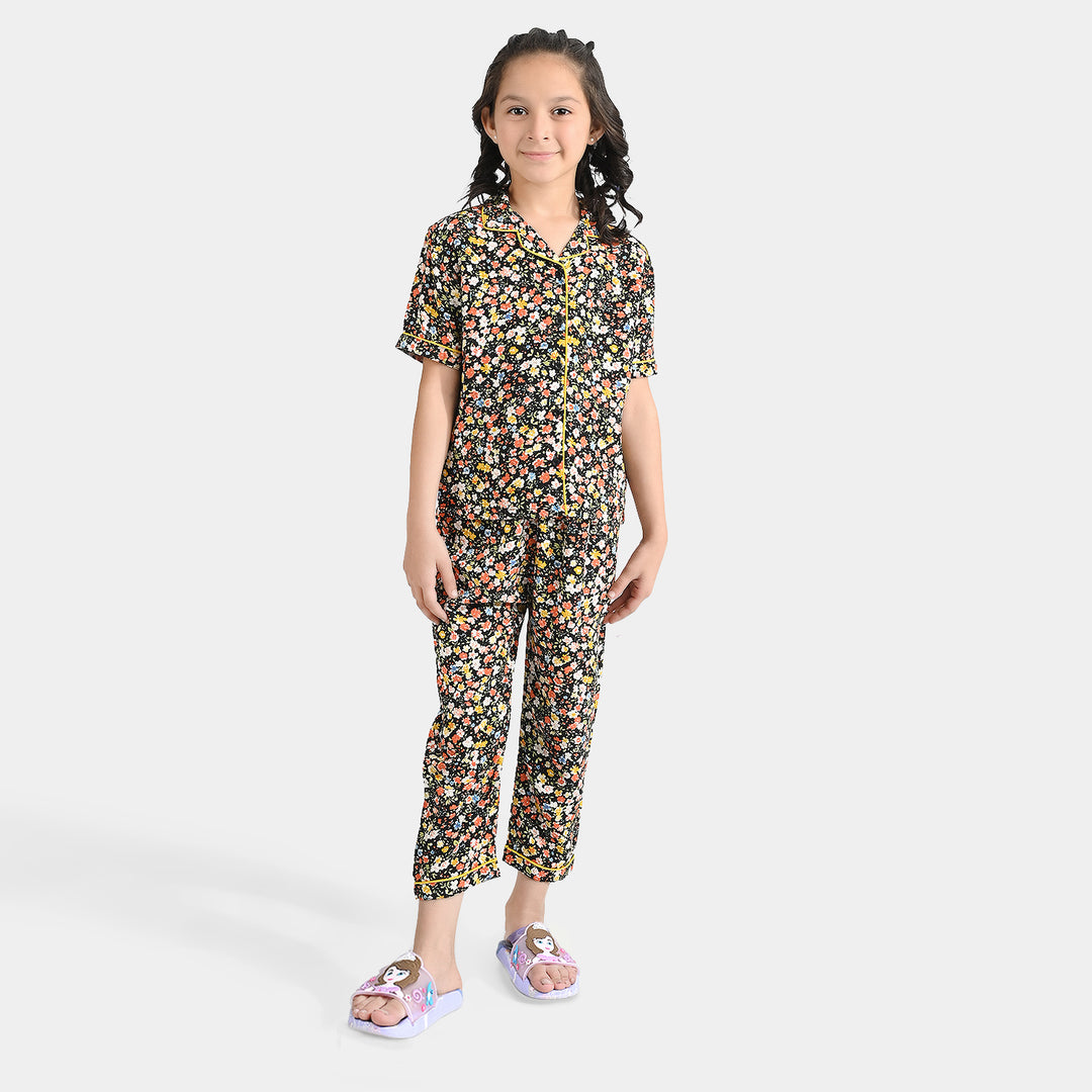 Girls Viscose Woven Nightwear Black Floral-Multi