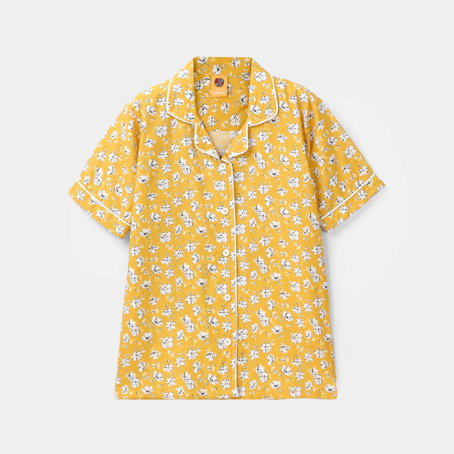 Girls cotton floral-printed mustard night suit features a front button-down style with a collar, half sleeves, and matching trousers for a comfortable and cozy sleepwear set.