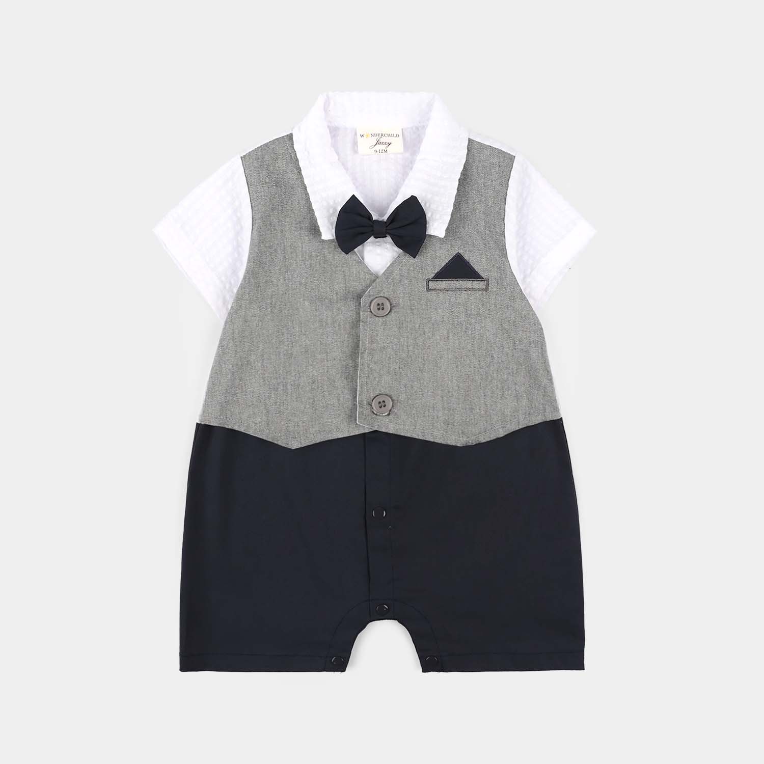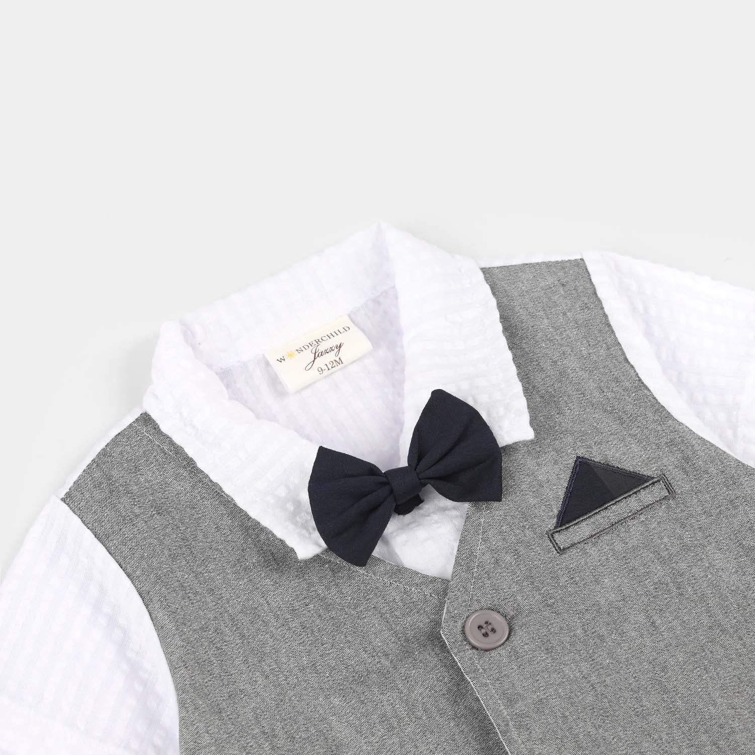 Infant boys' grey jersey/terry romper styled like a white shirt with collar and bow tie, featuring attached waistcoat detailing and snap button closure, perfect for a smart and comfortable festive look.