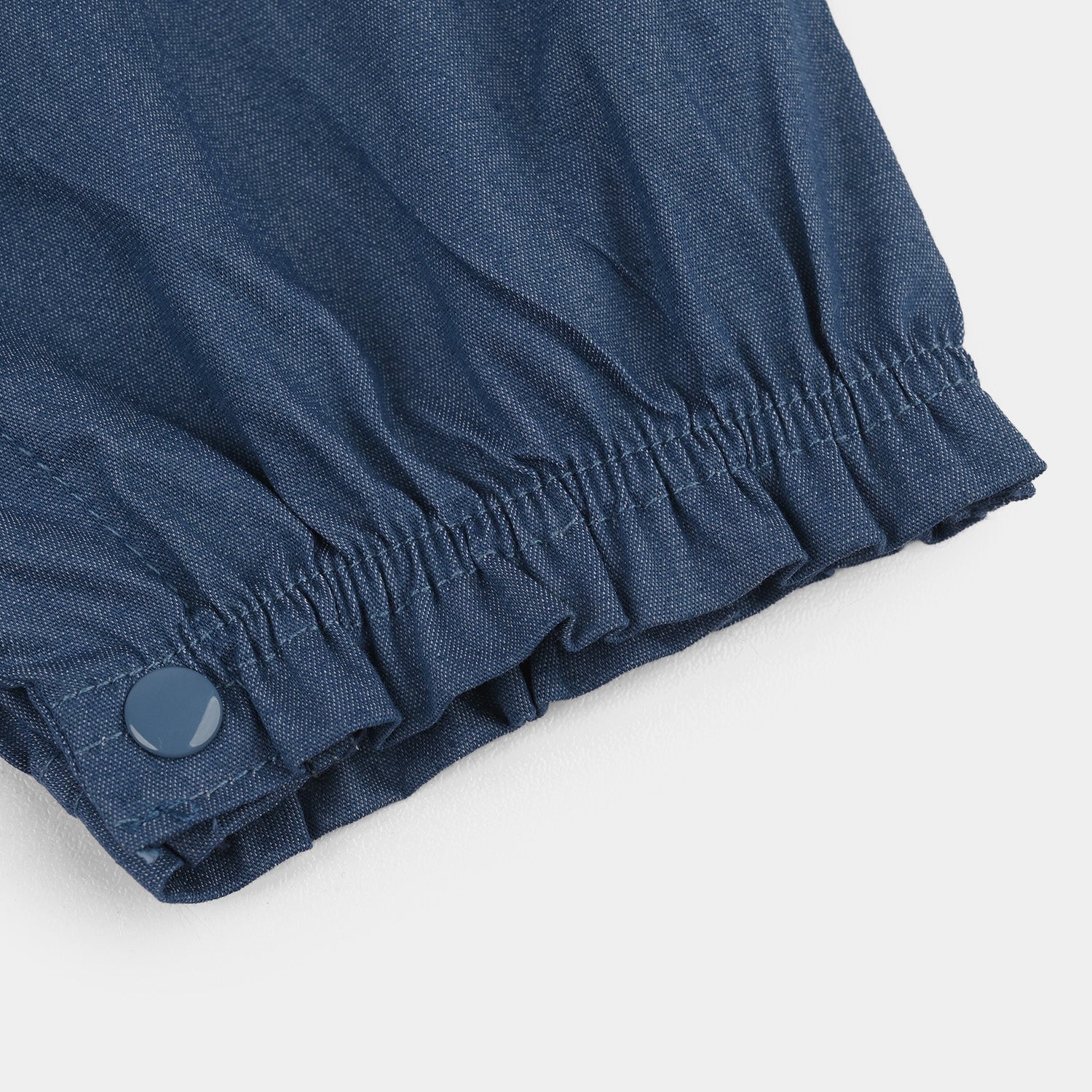 Infant girls' white and blue jersey/terry romper featuring a round neck, sleeveless design, flower detailing, and elastic contrast hem, perfect for a cute and comfortable everyday look.