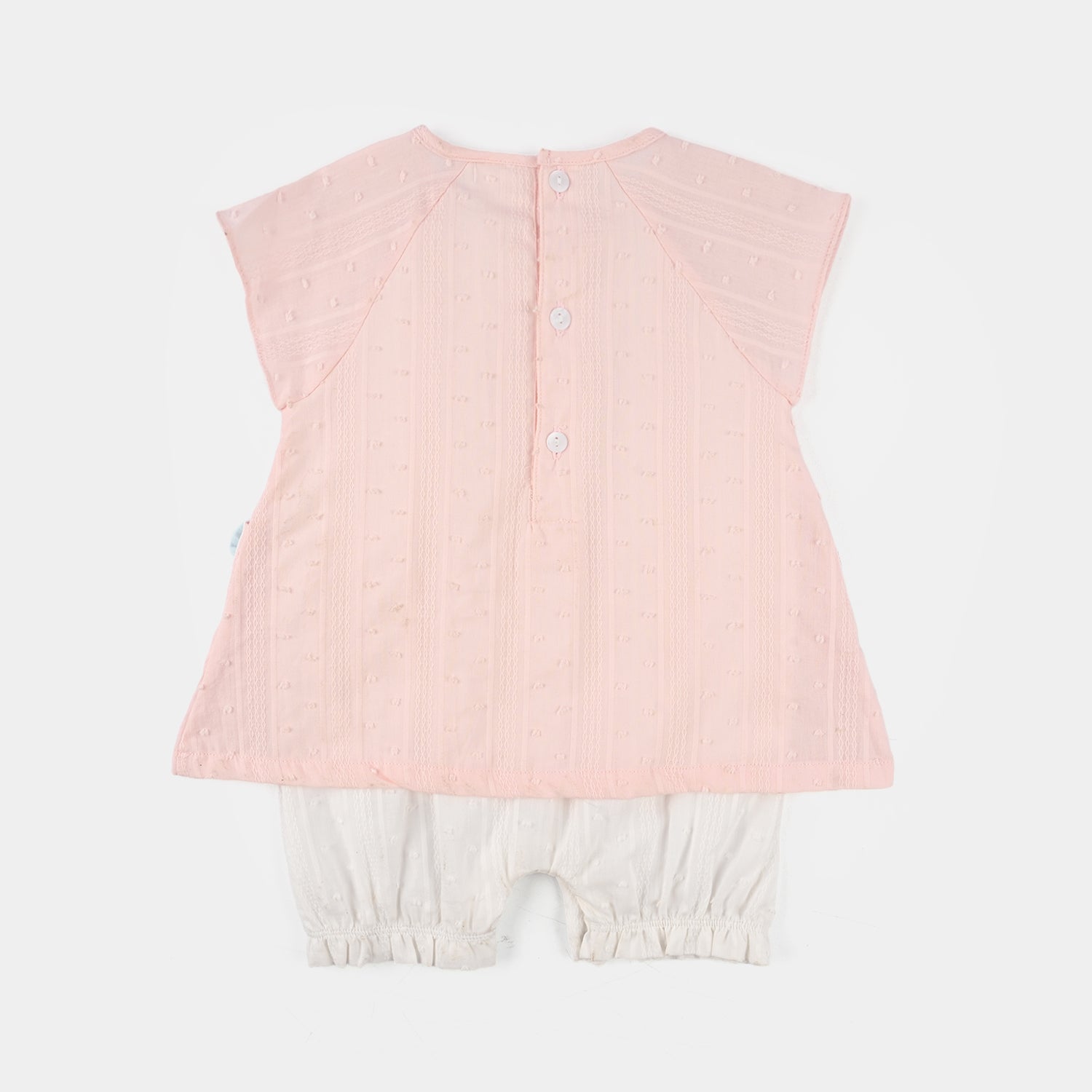 Infant girls' jersey/terry romper featuring a round neck, sleeveless design, pockets, bow detailing, and elastic contrast hem, perfect for a cute and comfortable everyday look.