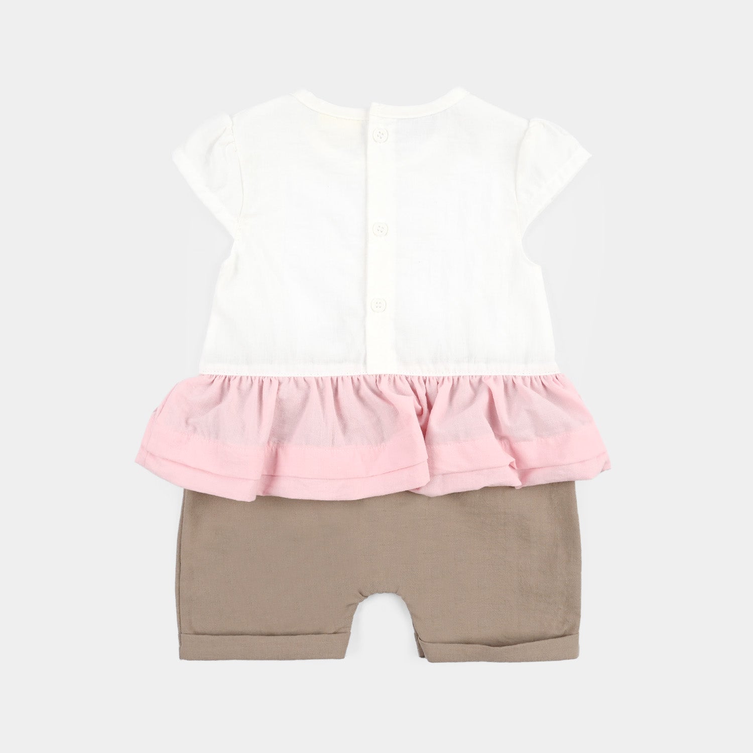 Infant girls' jersey romper featuring a round neck, half sleeves, a rabbit-themed print, and frill detailing, perfect for a cute and comfortable everyday look.