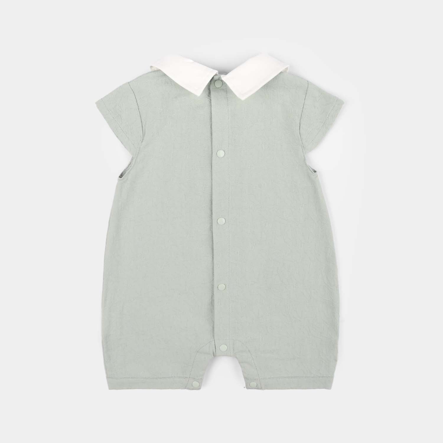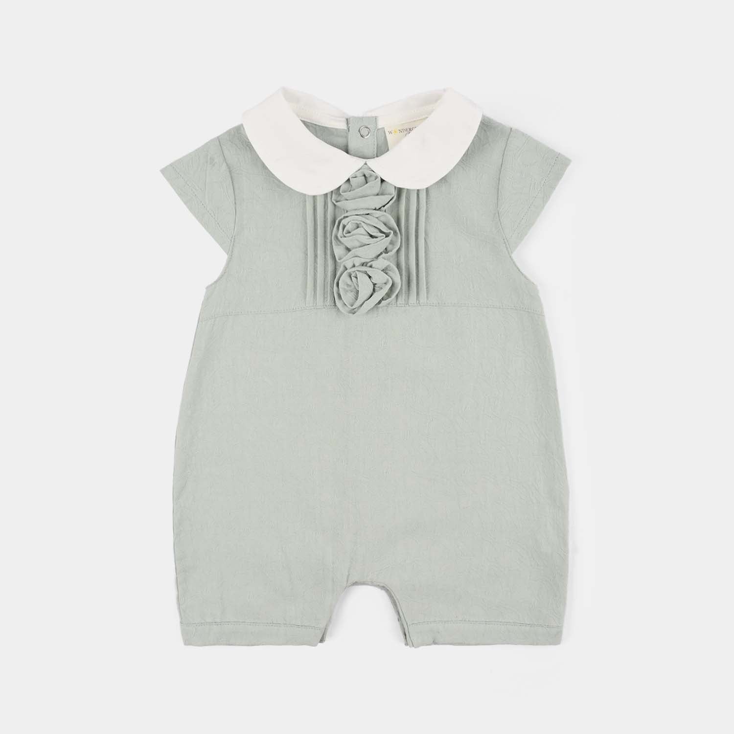 Infant girls' grey romper featuring a collar, short sleeves, short length, and design detailing, perfect for a cute and comfortable everyday look.