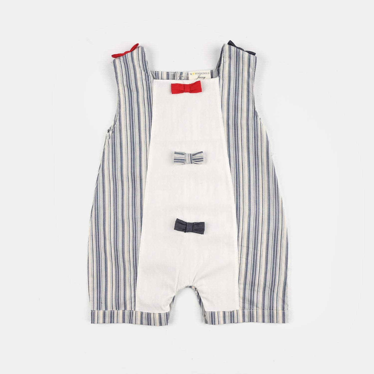 Infant girls' navy jersey/terry romper featuring a sleeveless design, short length, and bow embellishments with striped detailing, perfect for a cute and comfortable everyday look.