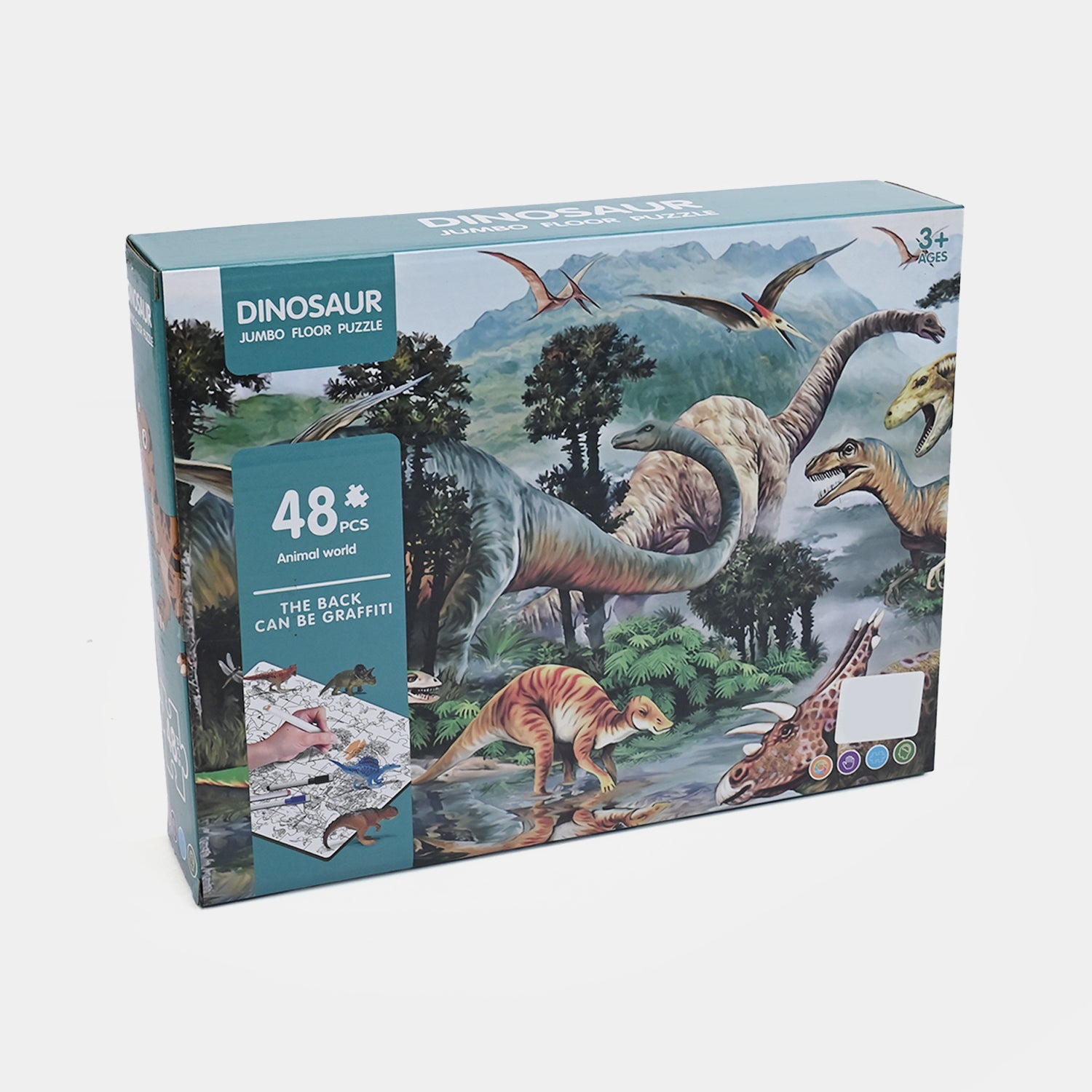 A 48-piece floor puzzle featuring dinosaurs, designed for ages 3+. Extra-thick cardboard pieces are easy for small hands to manipulate while developing problem-solving and coordination skills. The reversible design includes a coloring activity on the back for extended play value.