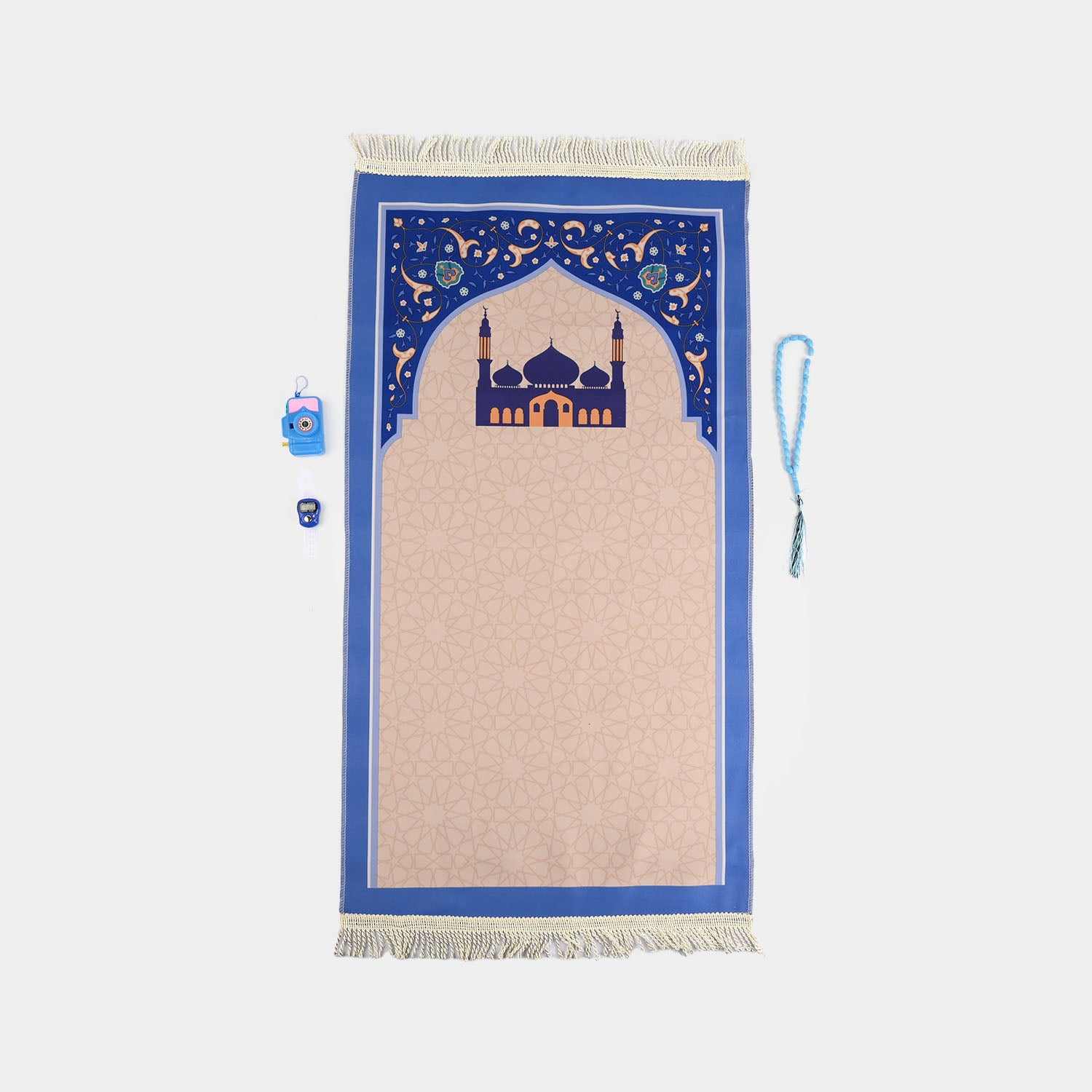 A soft cotton prayer mat for kids with a non-slip base. Features a Madina image projector, prayer beads, and digital counter to make prayer time fun and engaging.