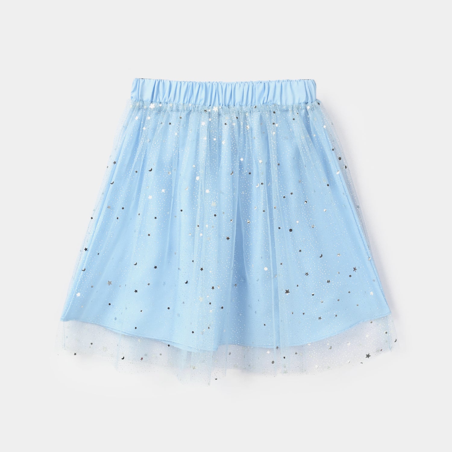 Skirt in blue features a star-themed net fabric and a comfortable elastic waistband for a playful everyday look.