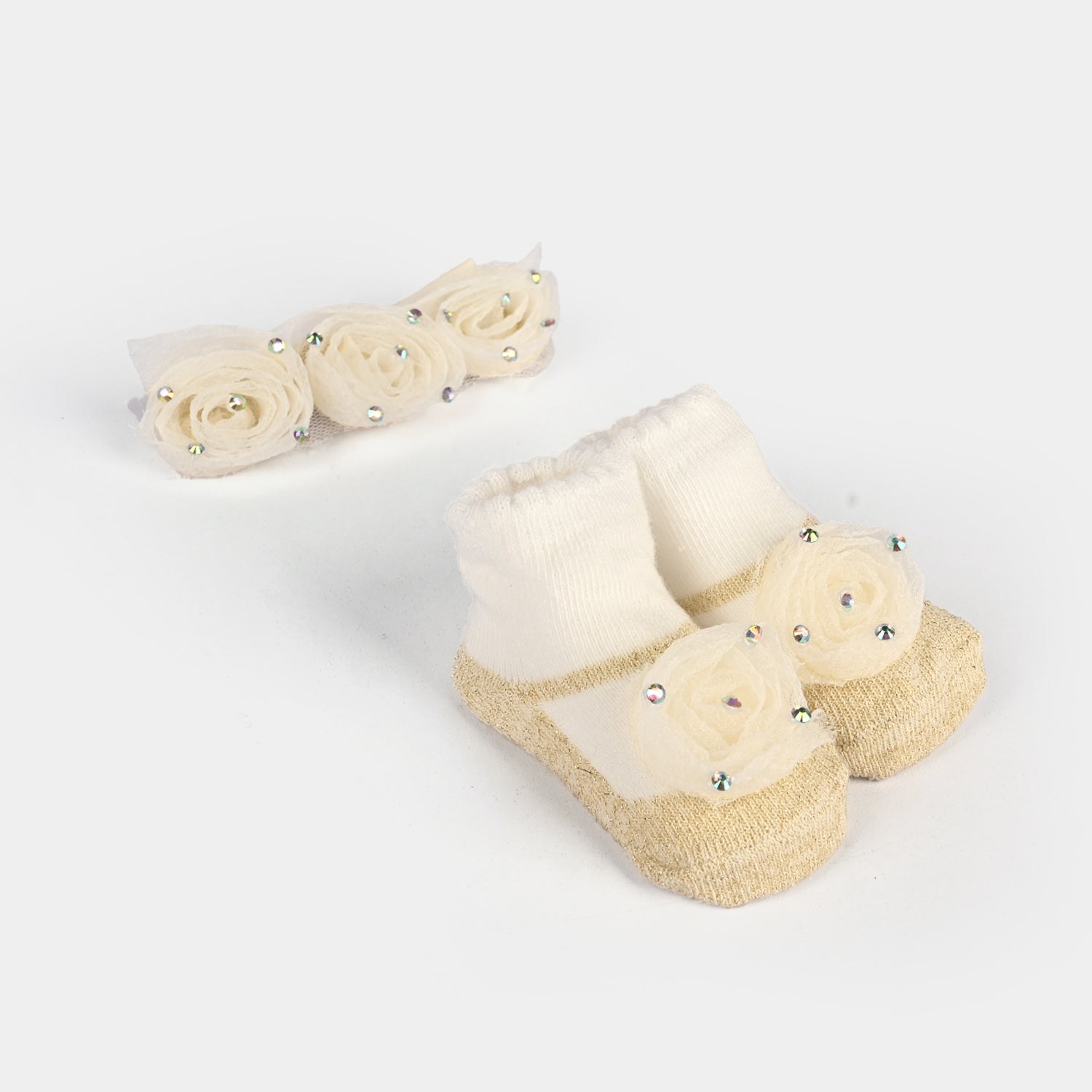 Born to be stylish! These cute booties paired with a cute headband add a sweet charm to the baby's attire. The beautiful floral socks are breathable and keep those toes cozy without overheating.