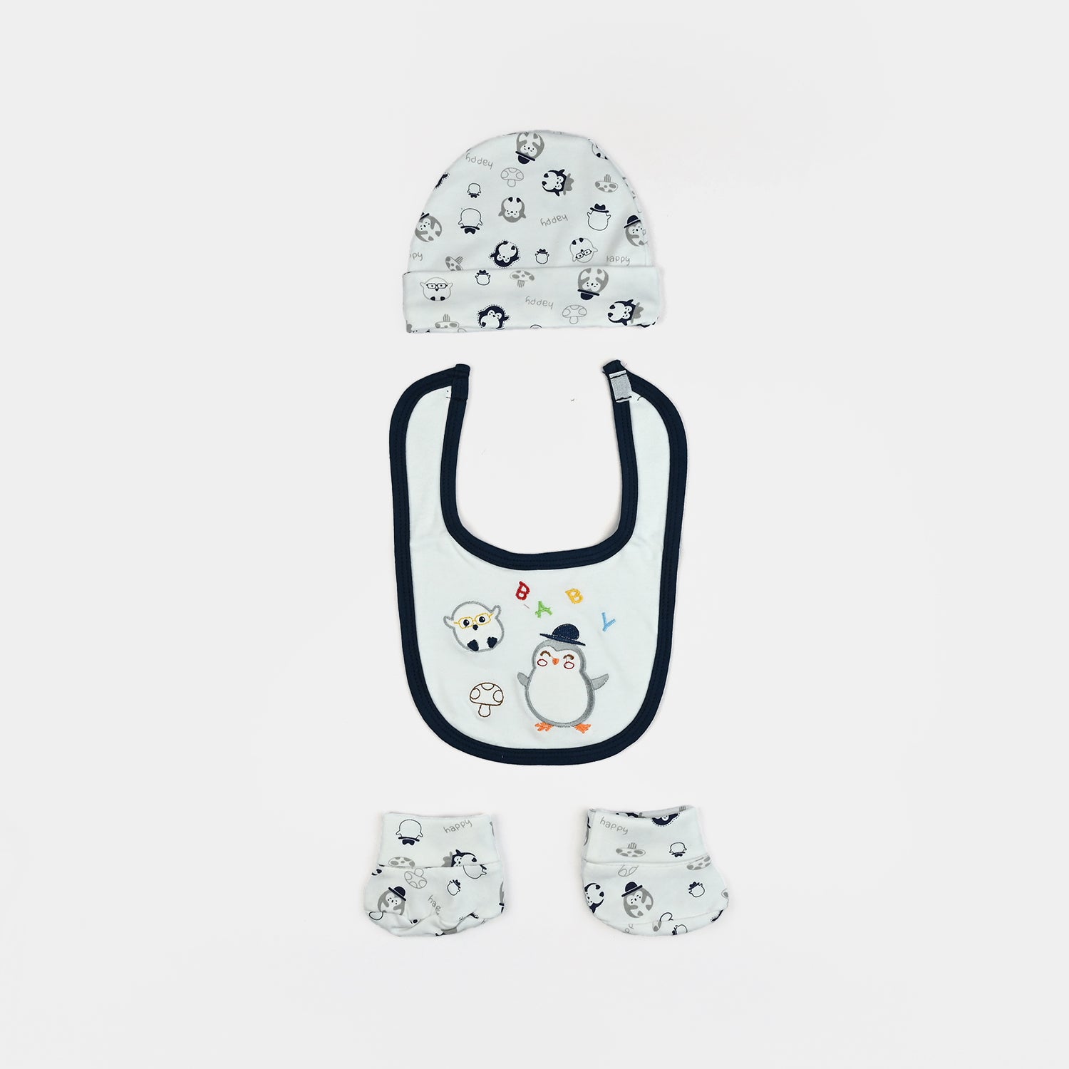 This set of essentials includes a bib, socks, a cap, and booties
