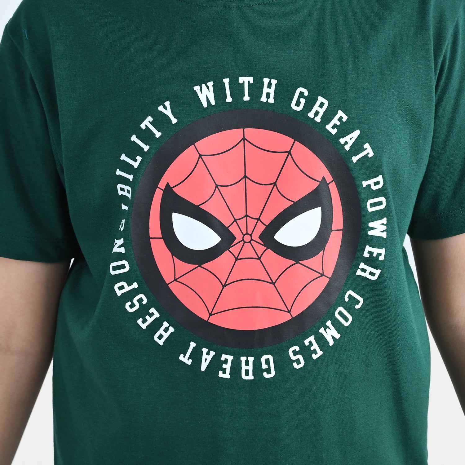 Boys' night suit in green features a Spider-Man theme, round neck, half sleeves, and matching pajamas for comfortable sleepwear.