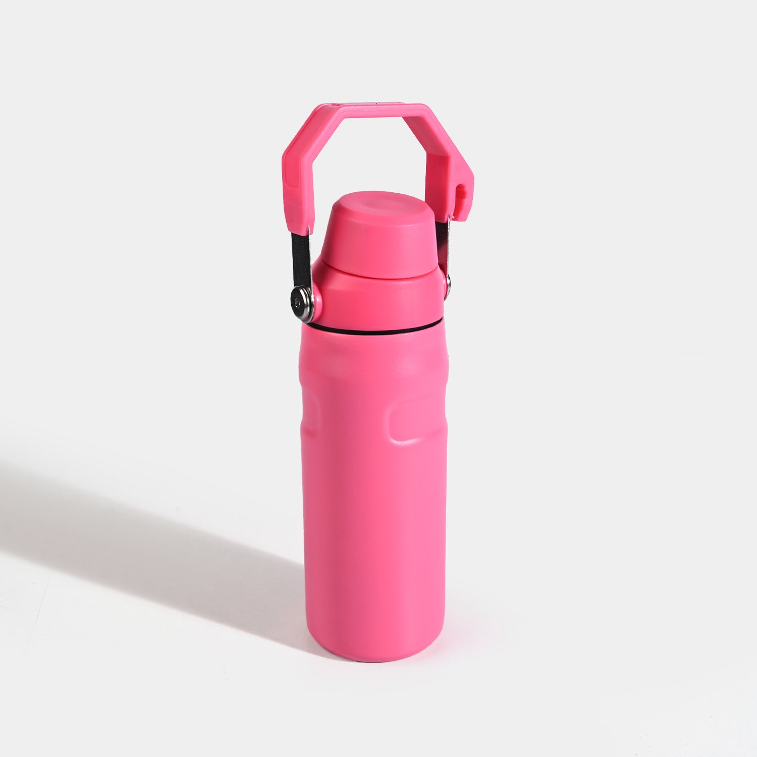 This pink stainless steel bottle features a secure cap and a gripping handle, with double-wall insulation to keep drinks hot or cold for hours, making it perfect for everyday use.