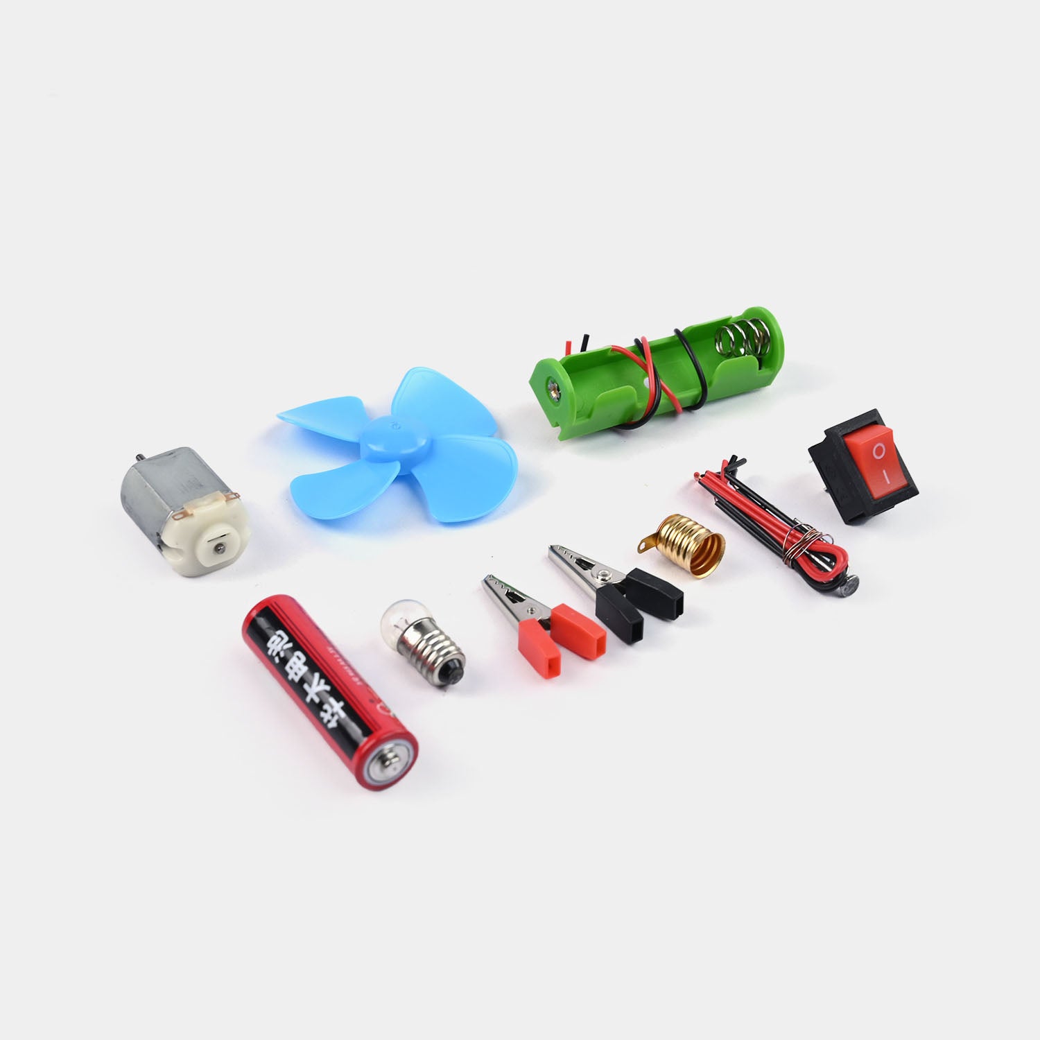 Complete Component Set: Includes motor, fan blade, switch, light bulb, wires, clips, battery holder, and springs.