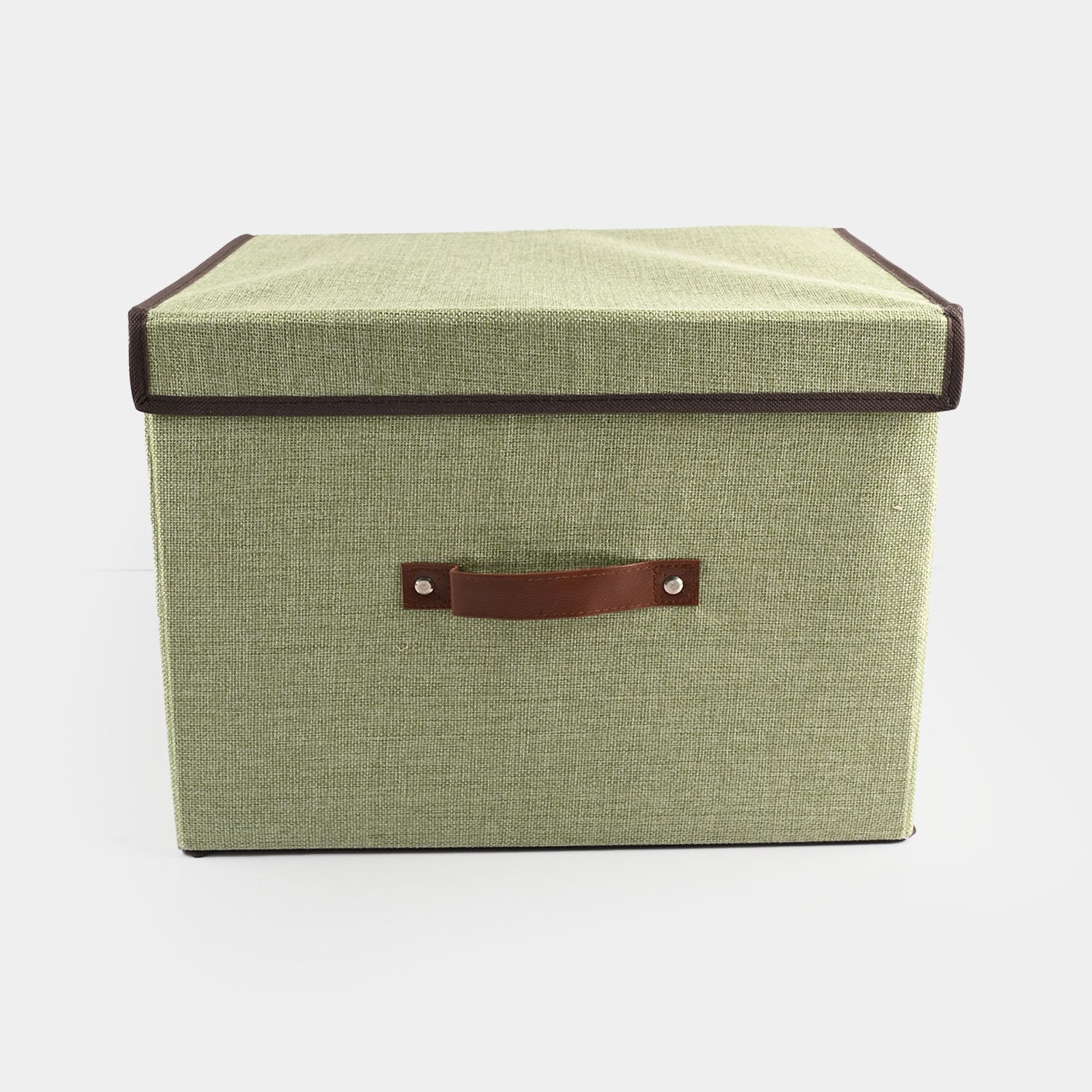Foldable fabric storage box featuring a durable exterior and reinforced frame for reliable organization. The soft green finish with brown accents complements any interior while accommodating clothes, toys, books, and household items. Lid closure keeps contents protected and dust-free. Folds flat for convenient storage when not in use.