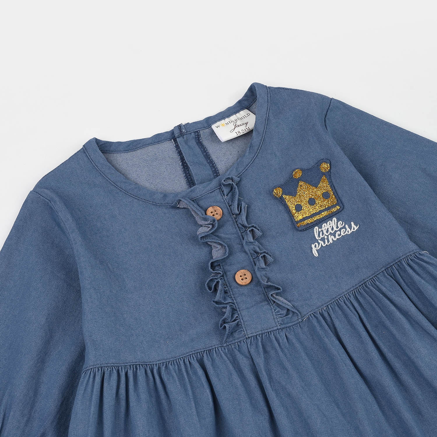 Infant girls' navy jersey terry 2-piece suit featuring a front-open round neck frock/top with full sleeves and embroidery detailing, paired with matching shorts, perfect for a stylish and comfortable everyday look.