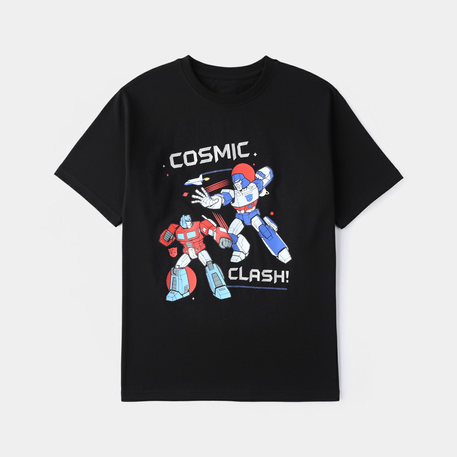 Boys’ cotton jersey T-shirt in jet black, featuring a round neck, half sleeves, and “Cosmic Clash” front print.