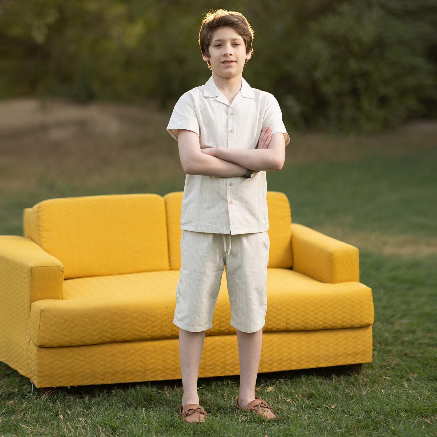 Boys’ yarn dyed woven suit in beige/white, featuring a collared, front-open shirt with half sleeves and matching shorts. A smart and comfortable set, perfect for casual outings and summer wear.