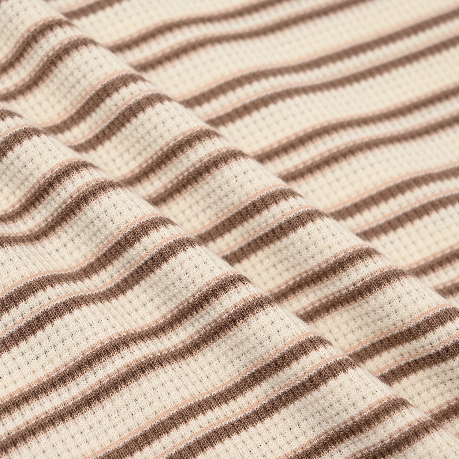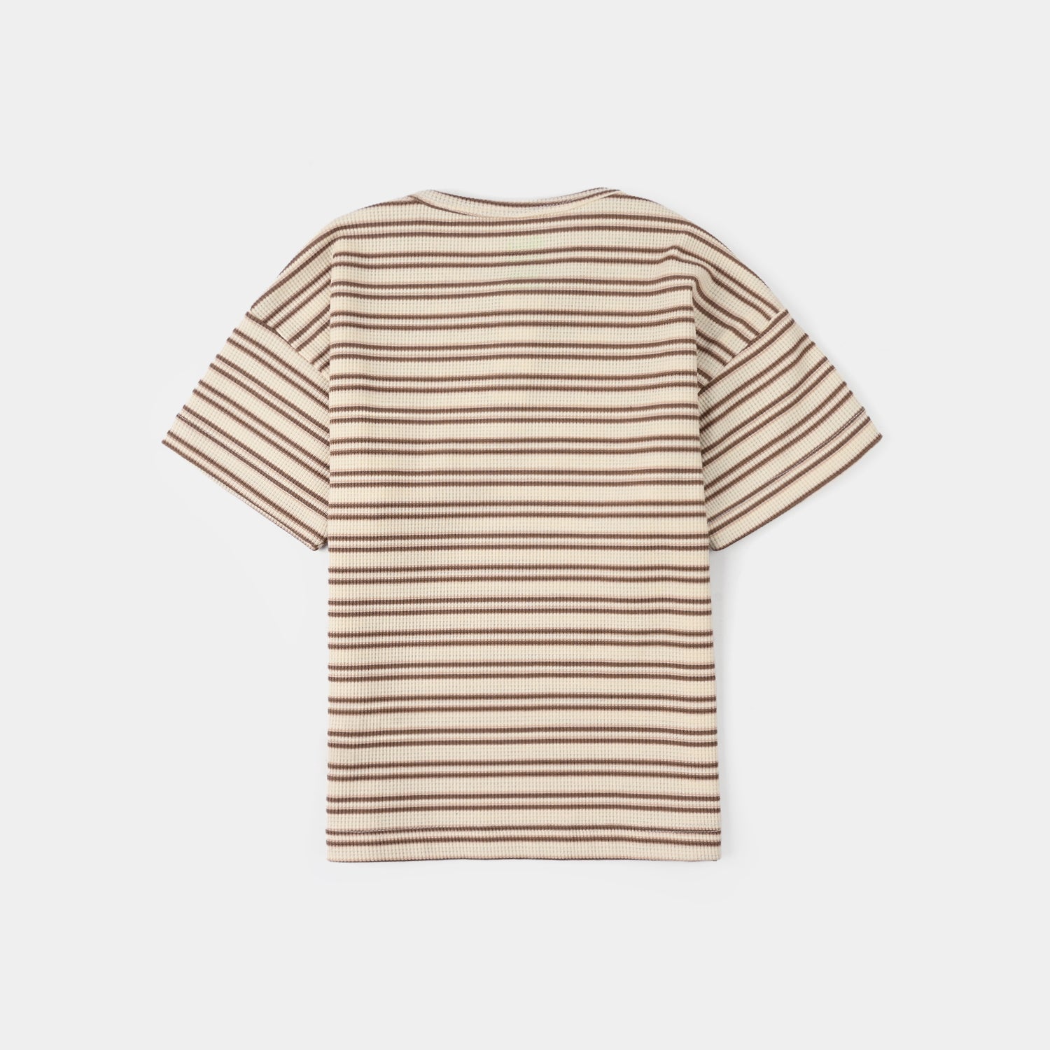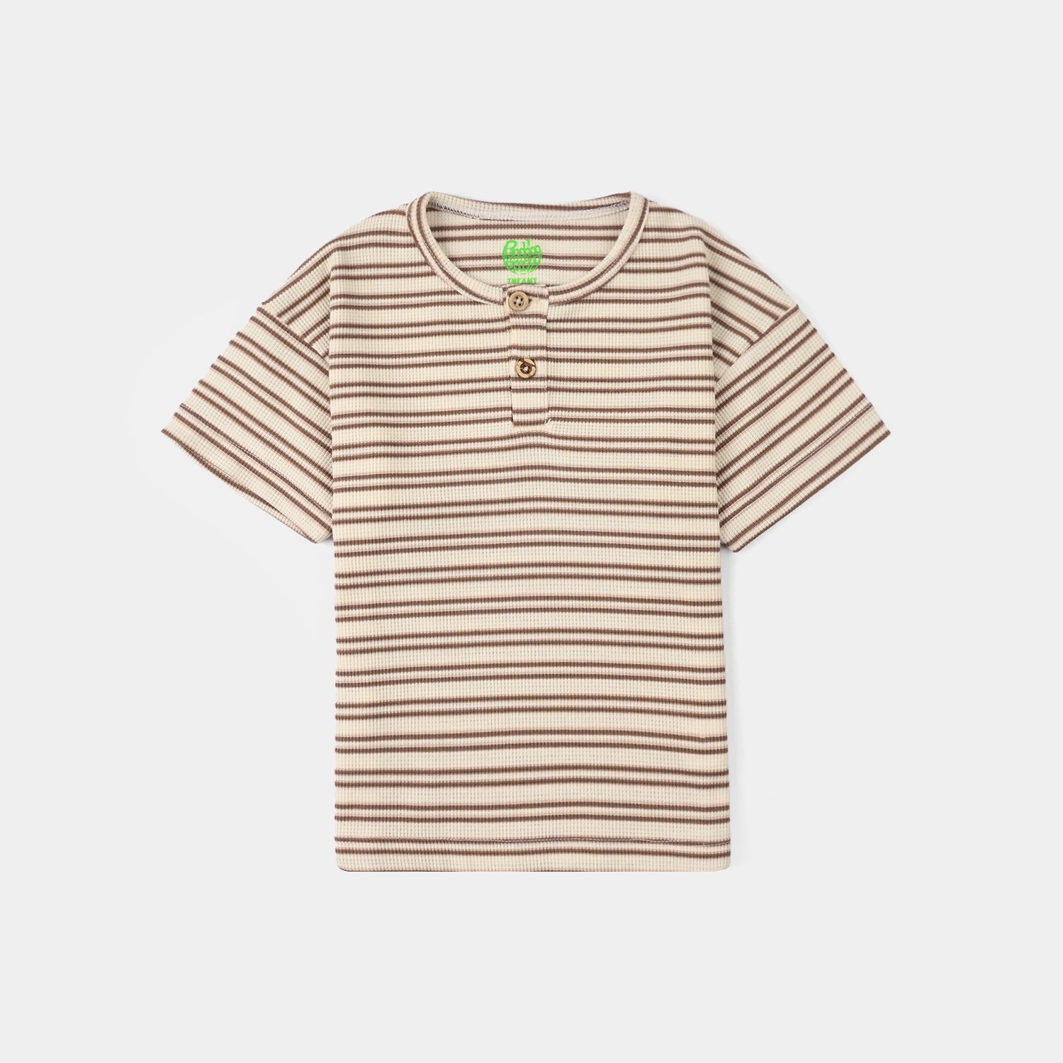 Infant boys’ yarn-dyed round neck T-shirt in brown, featuring a striped pattern and half sleeves.