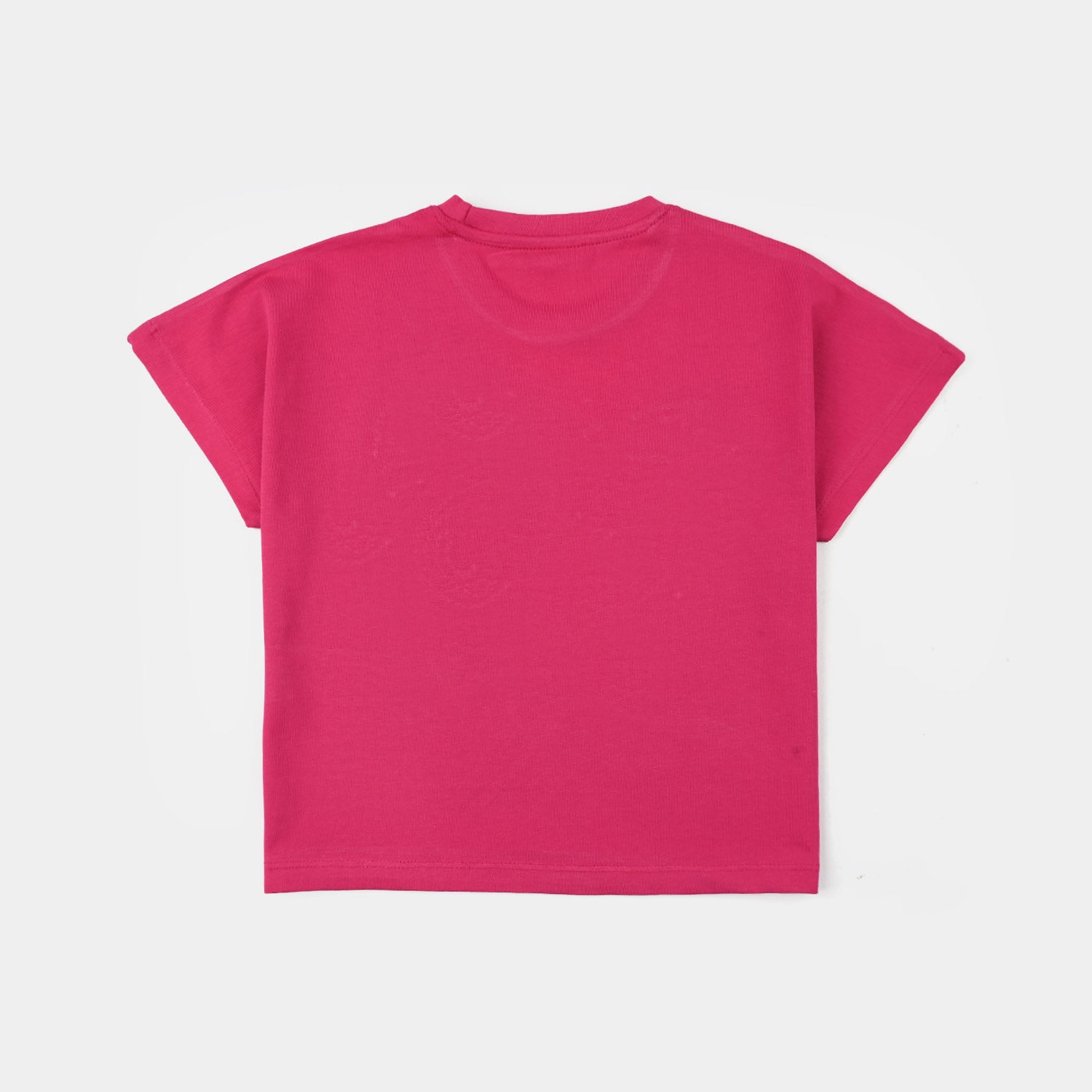 Girls’ jersey/terry T-shirt in vivacious/pink, featuring a round neck, half sleeves, and butterfly graphics on the front. Comfortable boxy fit, perfect for everyday wear.