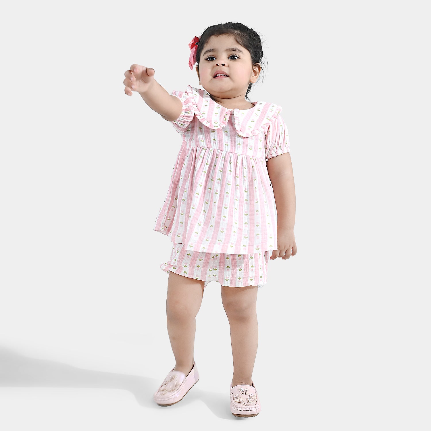 Infant girls' 2-piece suit Abstract Flower in white & pink features a Peter collar, half sleeves with elastic detailing, and matching shorts for a cute everyday look.