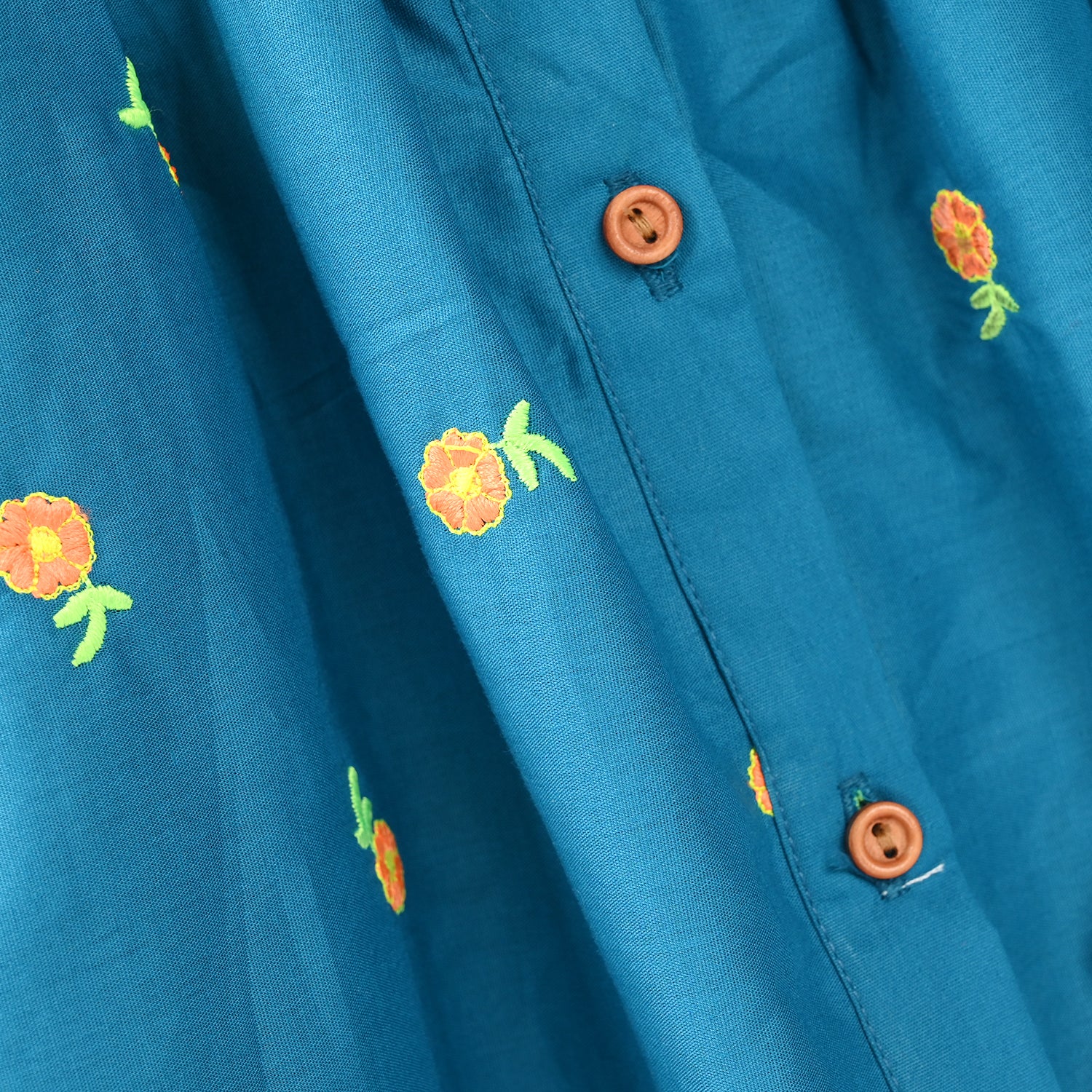 Infant girls’ cotton embroidered 2-piece set in royal blue and turquoise, featuring a round neck, front-open sleeveless kurti, and matching bottoms with pockets and elastic hem.