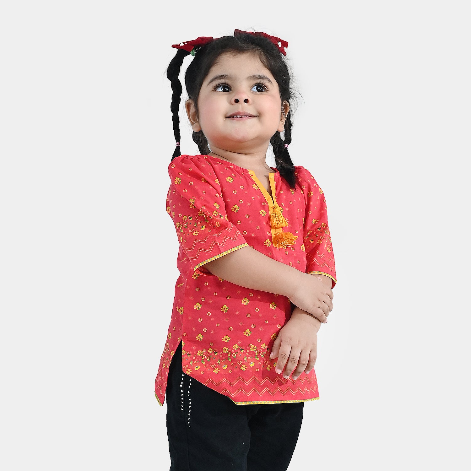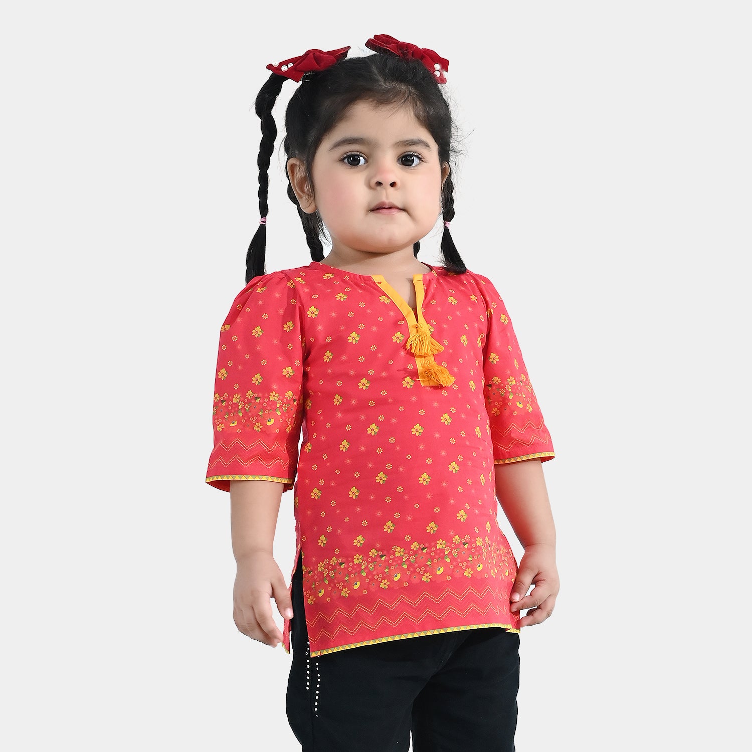 Infant girls’ cotton printed kurti in red, featuring tassel neck detailing, quarter sleeves, and a comfortable fit, perfect with shalwar, jeans, or tights.