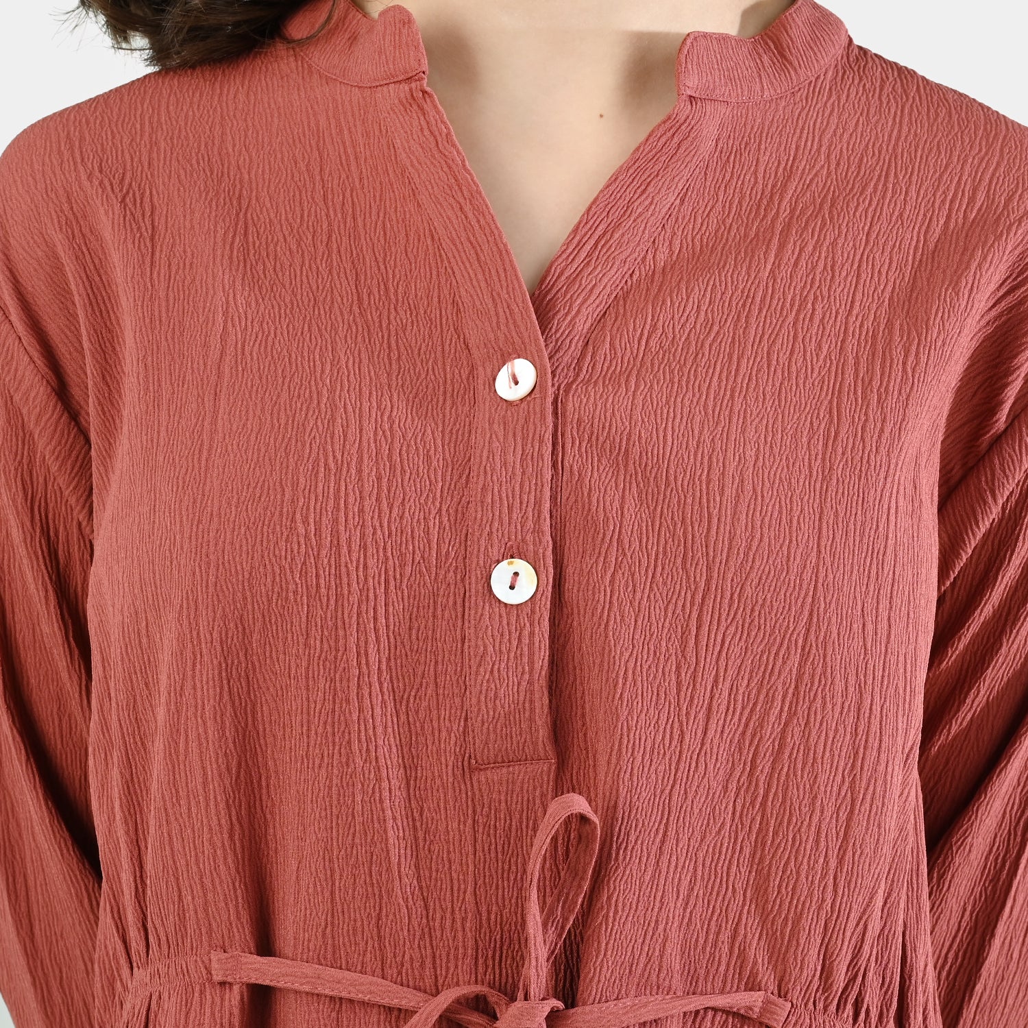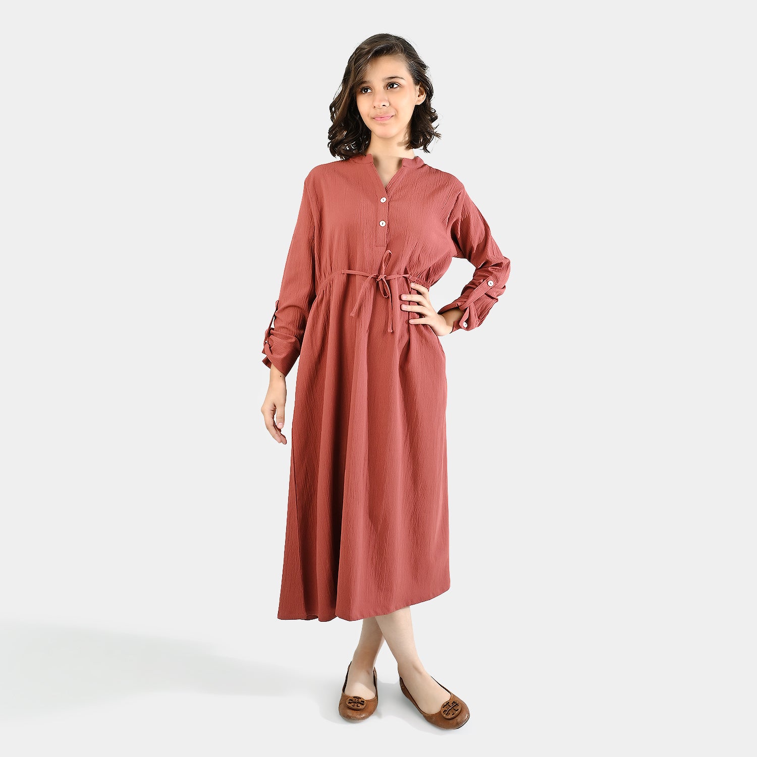 This pretty peach solid A-line dress in soft cotton features full-length sleeves, a drawstring bow, effortlessly blending timeless style with everyday comfort.