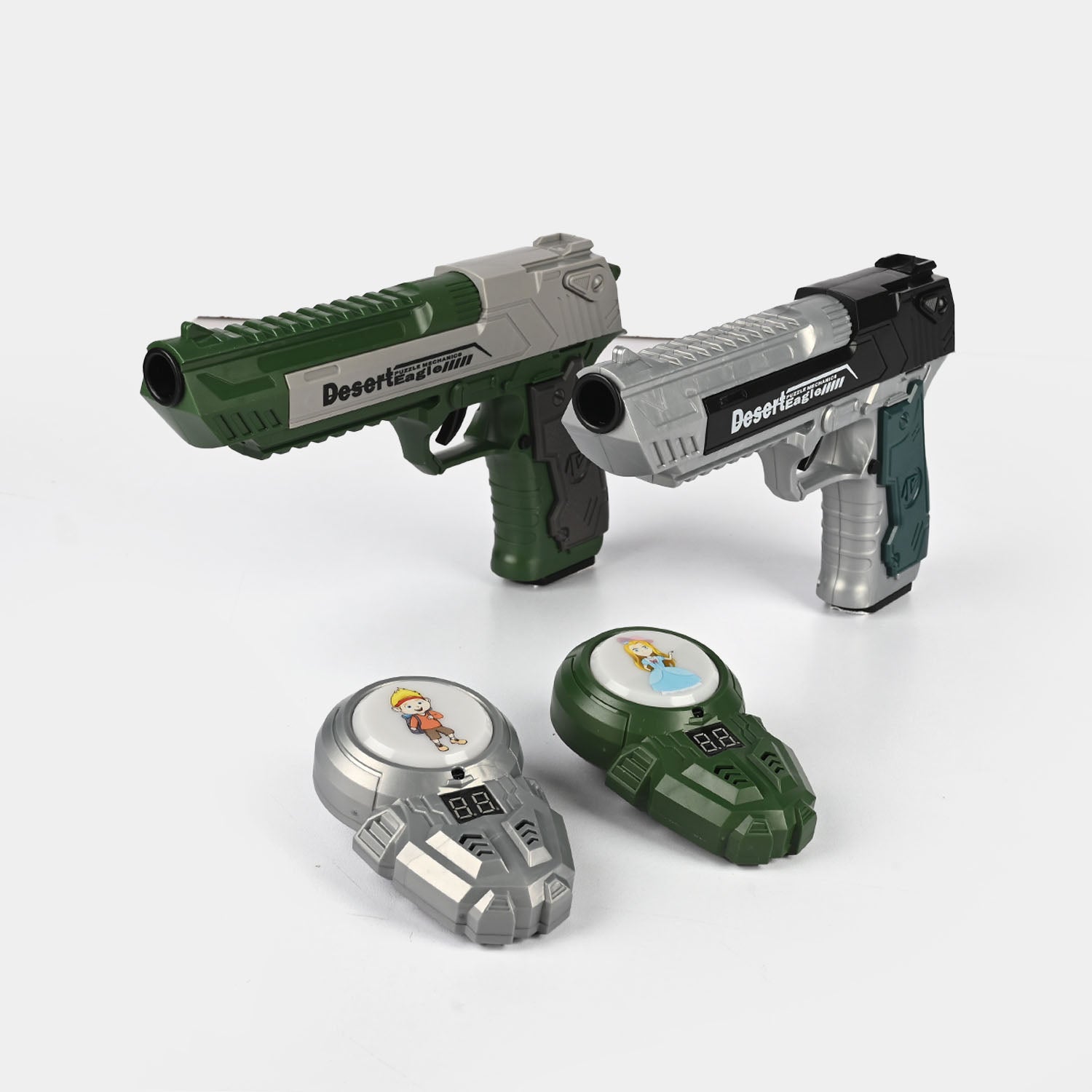 Package Includes Blaster guns, interactive devices, instructions
