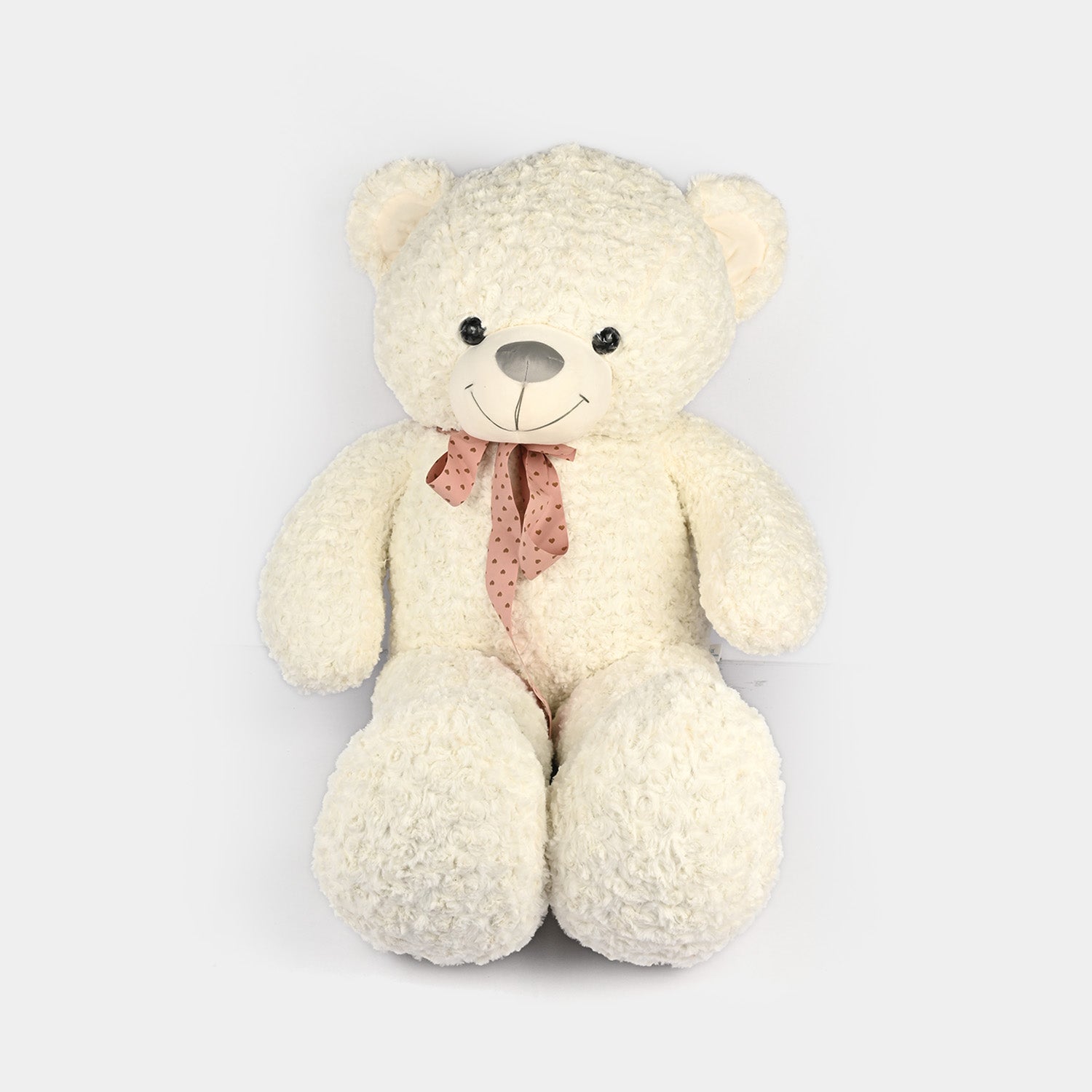 This 120cm plush teddy bear offers children a soft, huggable companion with cream-colored fur and a charming pink polka-dot bow. Perfect for cuddles or room décor.
