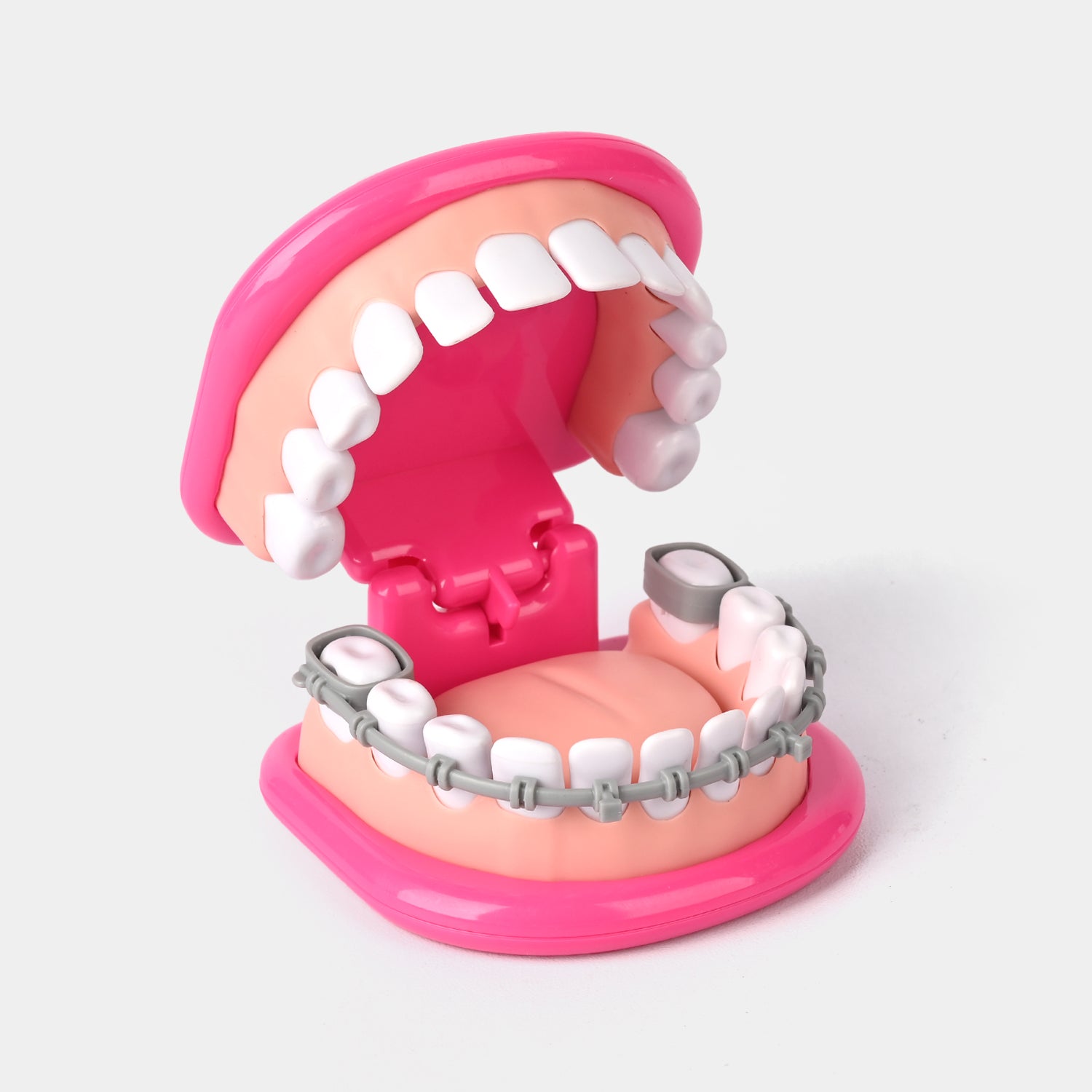 A pretend play dentist set that teaches kids about oral hygiene while easing dental anxiety. Includes a mouth model with braces, two electric toothbrushes, rinse bottle, a toothpaste tube, cup, and dental tools. Built from safe, durable plastic for extended imaginative play and practical learning.