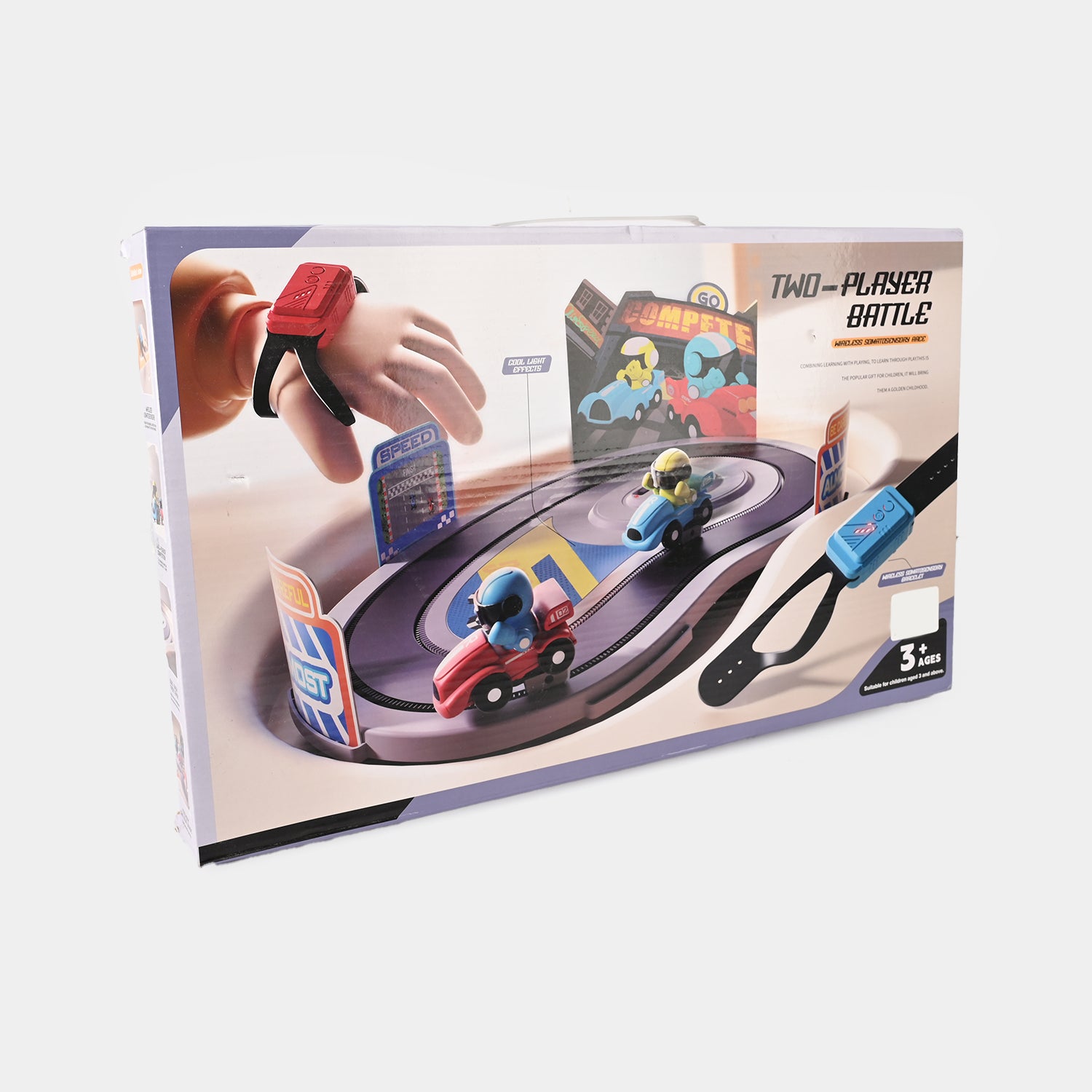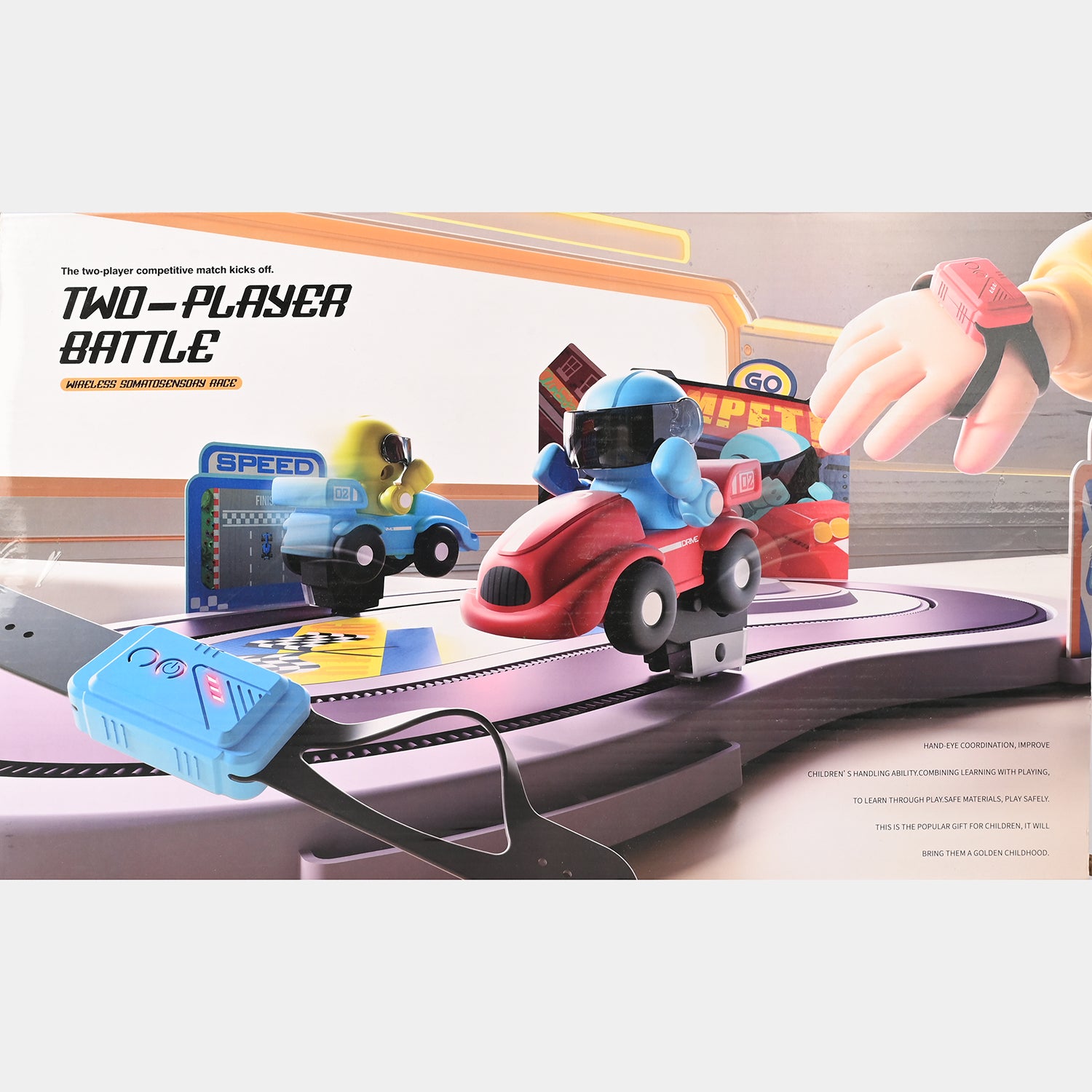 Get ready for fast-paced, head-to-head excitement with the Two-Player Battle Racing Track Set! This interactive racing game lets kids compete using wearable motion-controlled wrist remotes that bring the vehicles to life on the track. With looping curves, sharp turns, and colorful racer characters, this set delivers nonstop fun for children ages 3 and up.