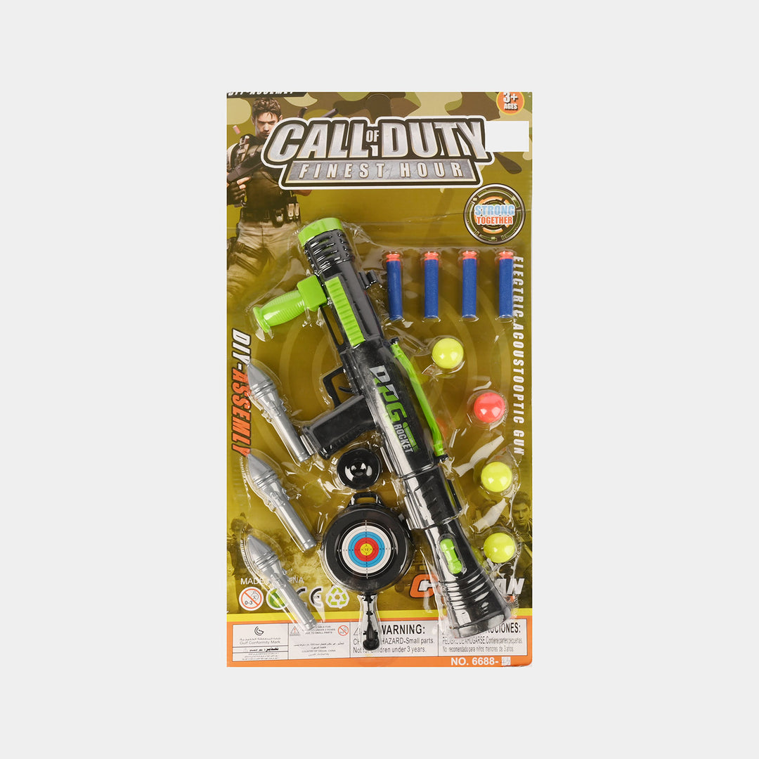 Inspired by Call of Duty, this toy gun set features a rocket launcher-style blaster, and safe soft bullets for fun, interactive play. Its DIY assembly encourages hands-on creativity.