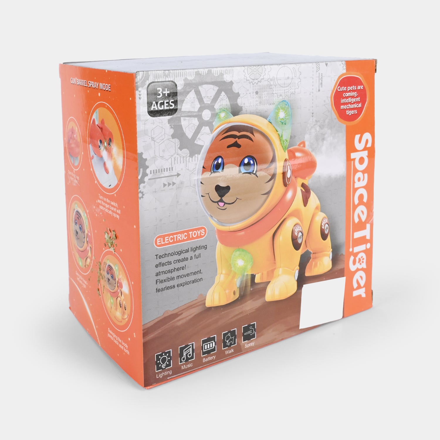 Lighting, Music, Battery operated, Walking, and Spray effects |