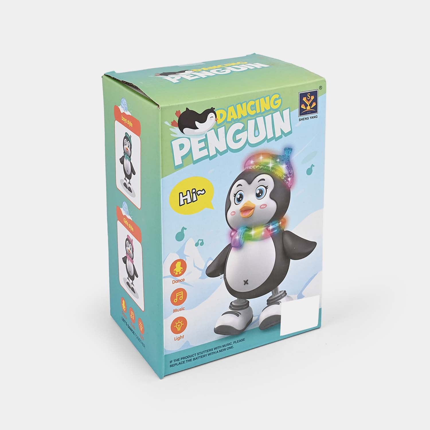 Penguin character with a light-up translucent hat and scarf |