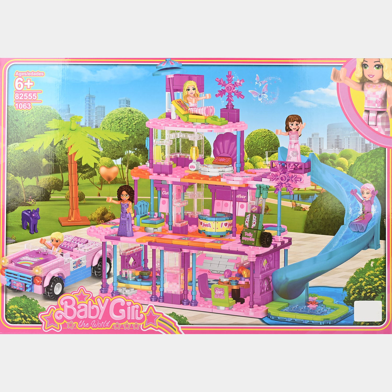Girls Series Building Blocks is a vibrant construction set featuring a pink villa with slide, a convertible car, and character figures. Perfect for developing spatial reasoning and creative play, this multi-piece set encourages imaginative storytelling and hands-on building skills in young builders.