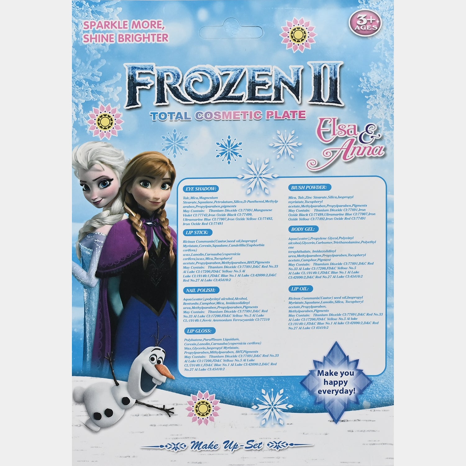 This girls’ makeup set is a fun and colorful beauty collection featuring shimmer lip gloss, glittery eye shadows, and scented surprises. Offering creative play alongside dress-up fun. Safe and tested for kids ages 3 and up.
