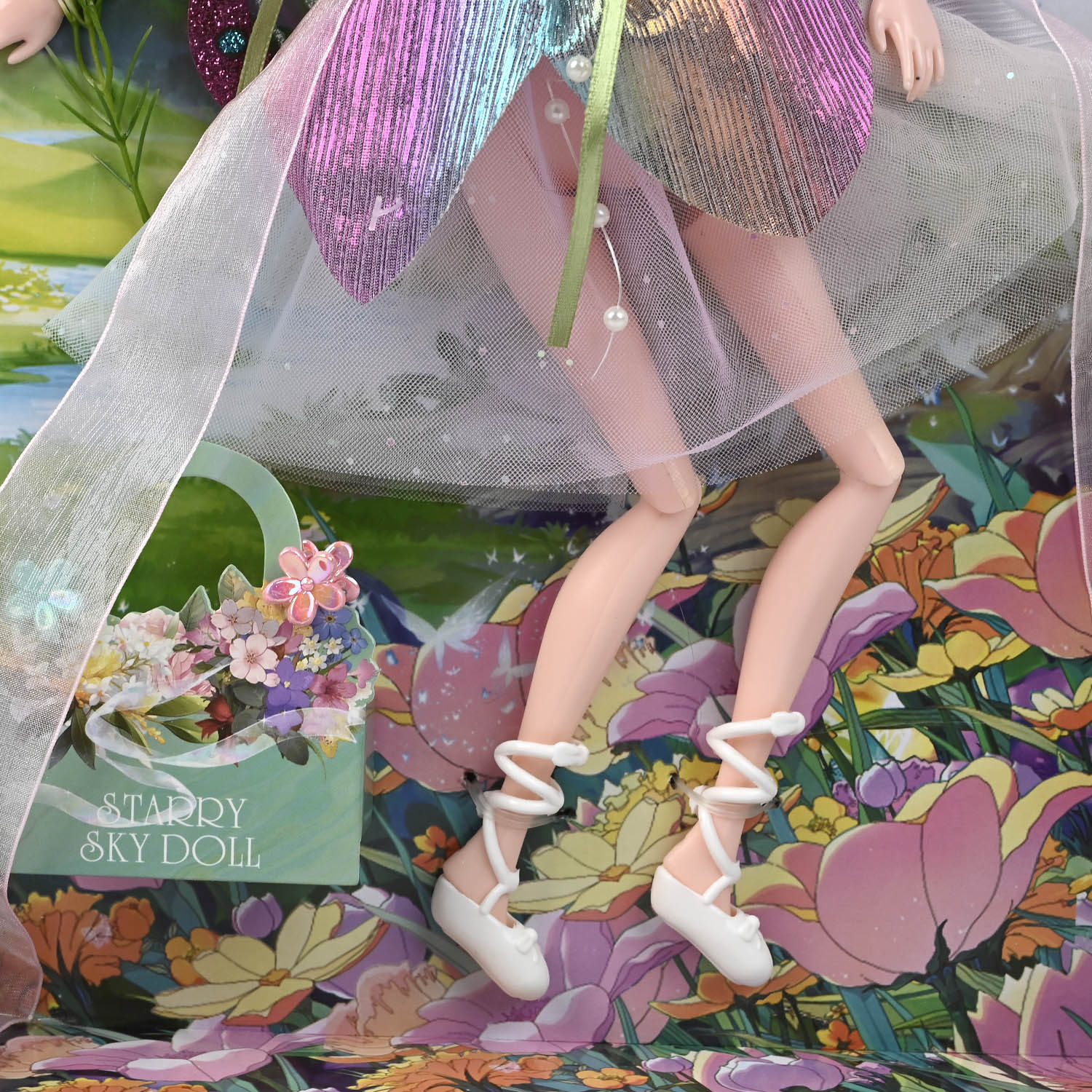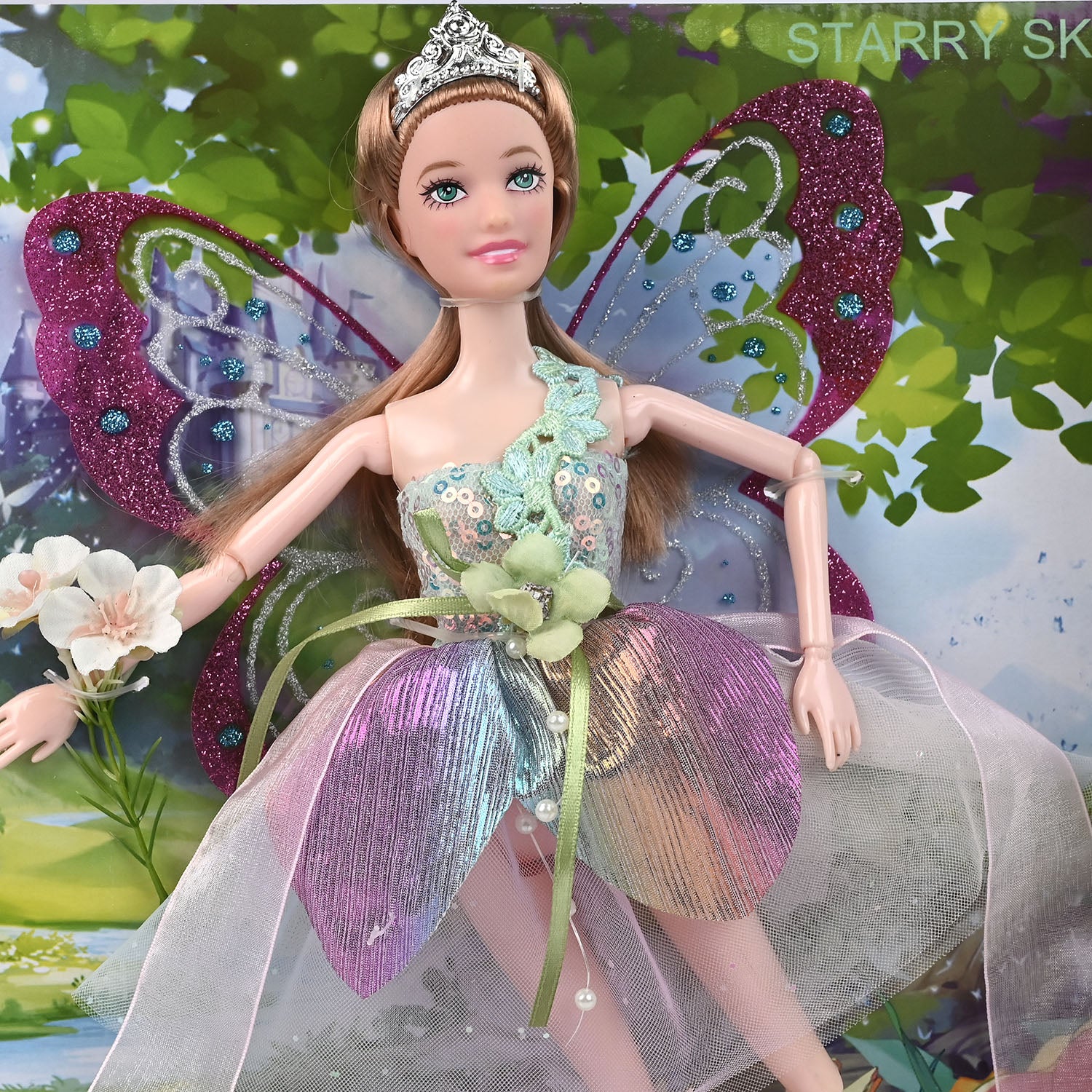 A charming fairy doll with sparkling wings, a colorful pastel dress, and delicate flower details. Perfect for collectors who appreciate magical, whimsical designs.