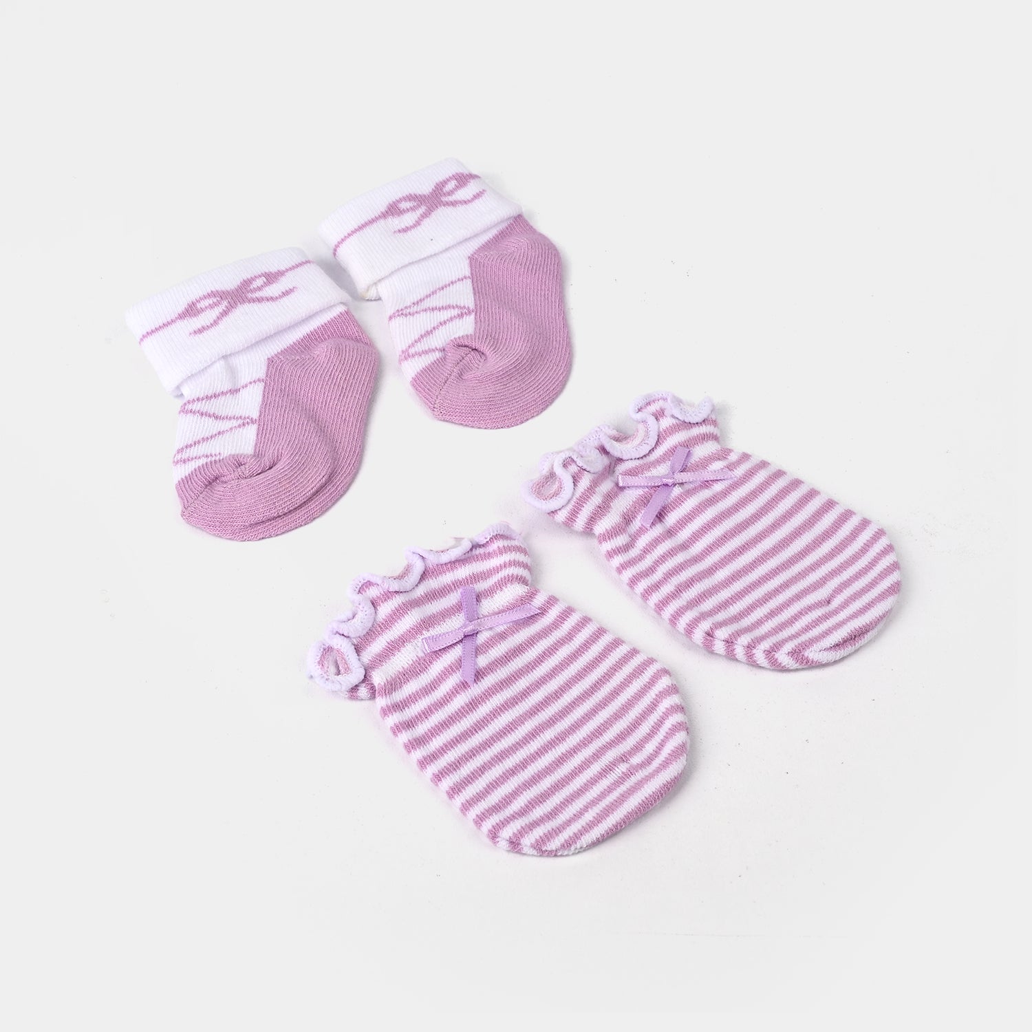 Soft, stretchy mittens and socks set designed for an infant. Made from breathable materials that provide warmth and comfort while allowing natural movement. Perfect for cooler weather and everyday wear.