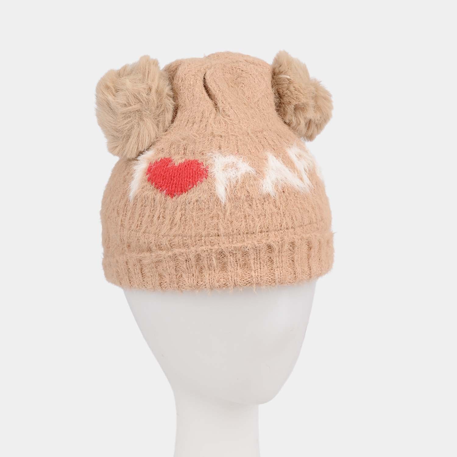 This brown cozy winter accessory features a “I Love Papa” design on the front, with a white and red color scheme and fluffy pom-poms on top, making it both cute and stylish.