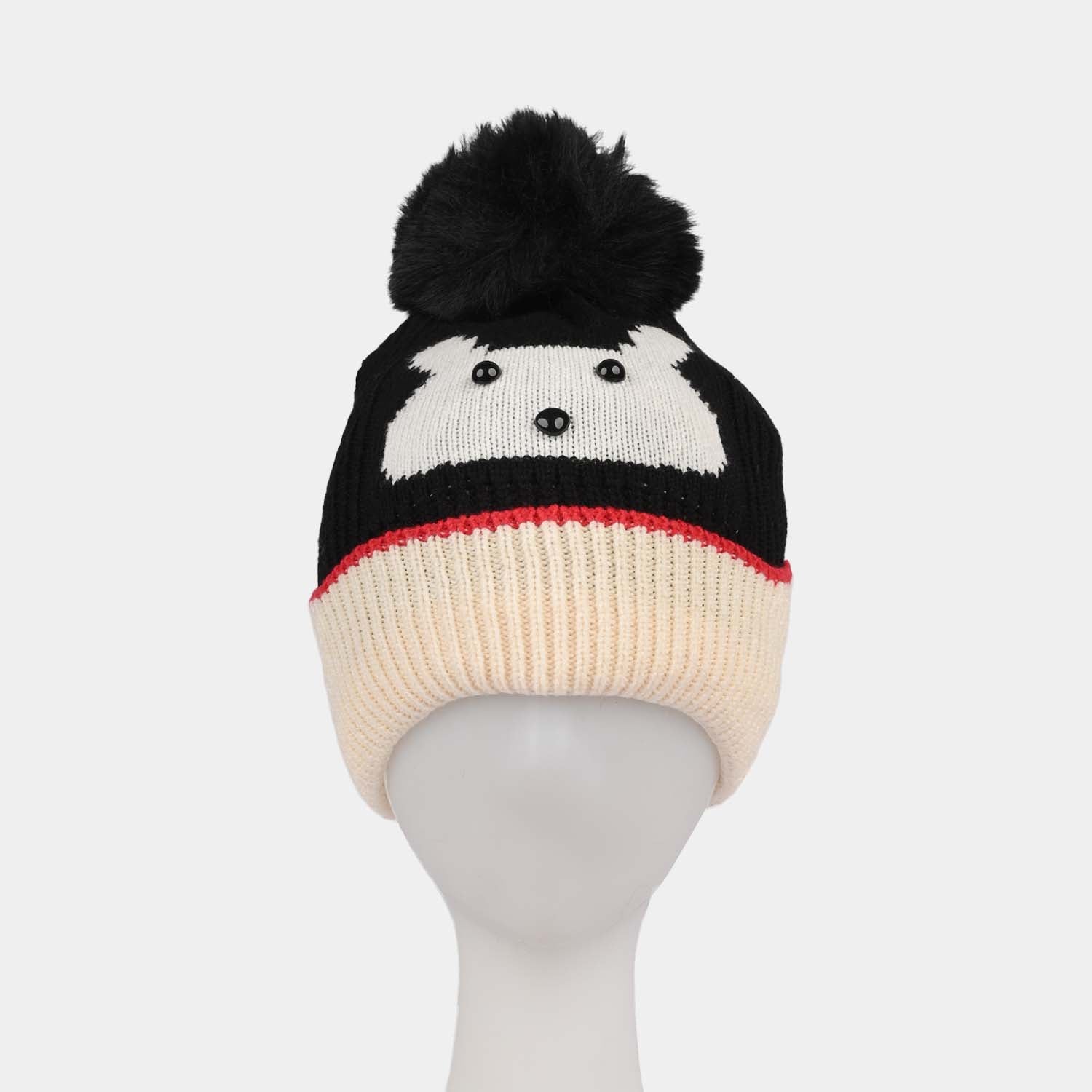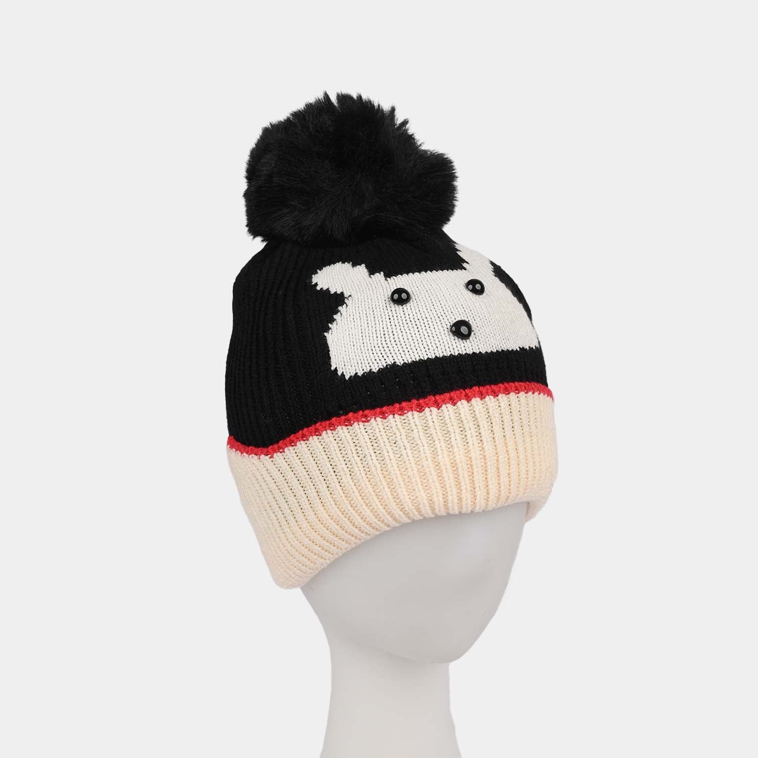 This cozy, fun beanie features a playful dog design on the front, with a black and cream color scheme. It has a red stripe around the base and a fluffy pom-pom on top, making it a cute and stylish accessory for the winter.