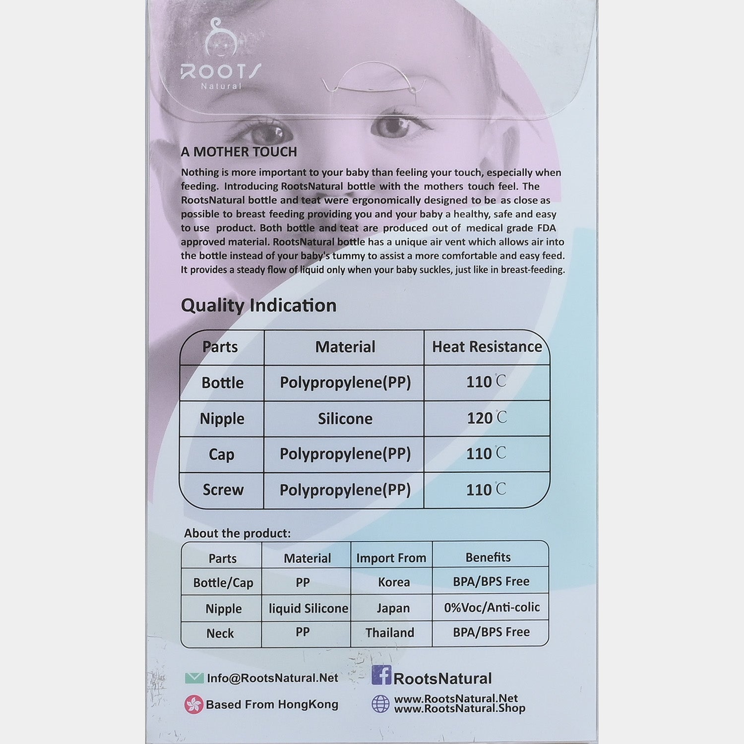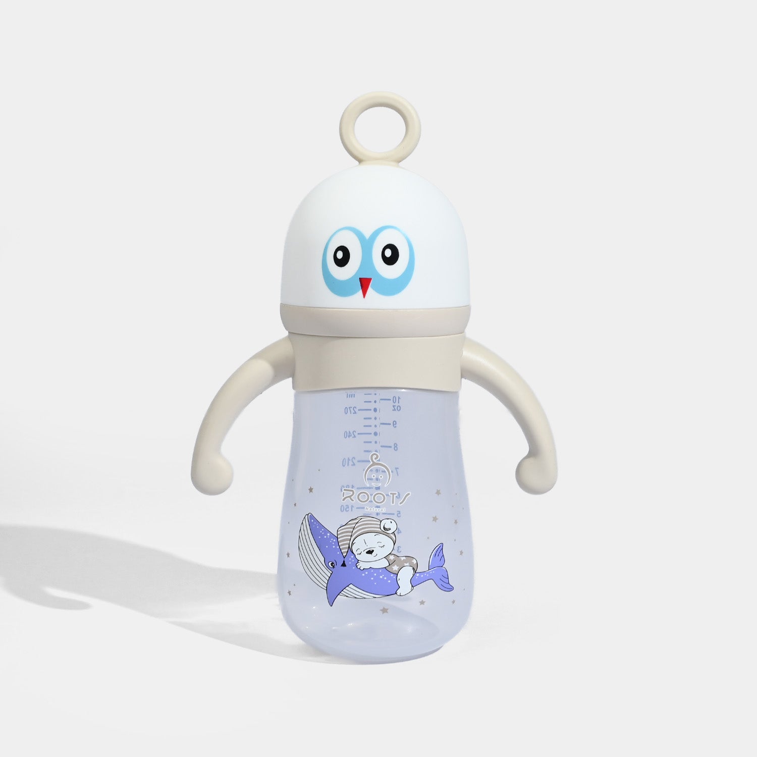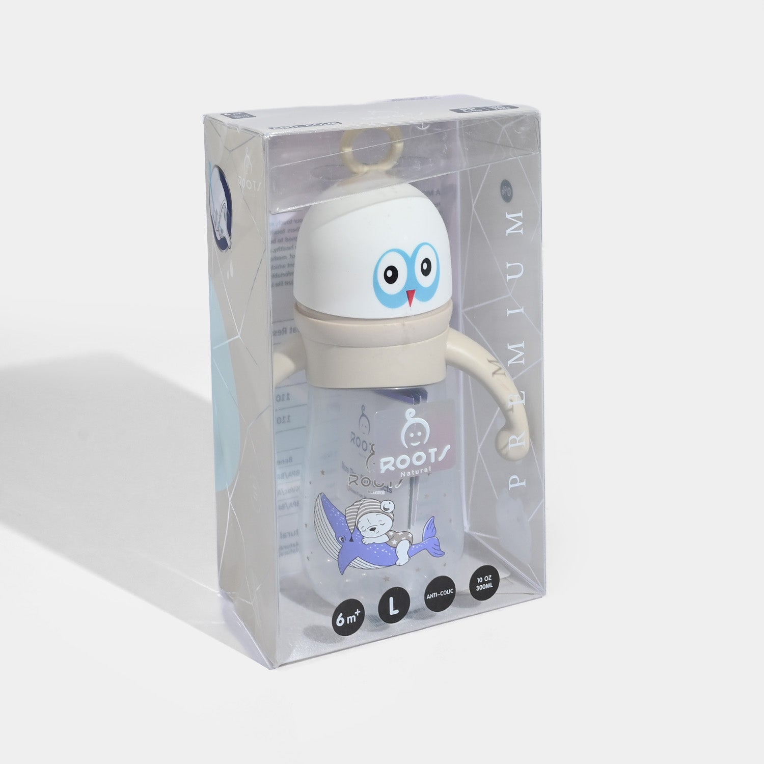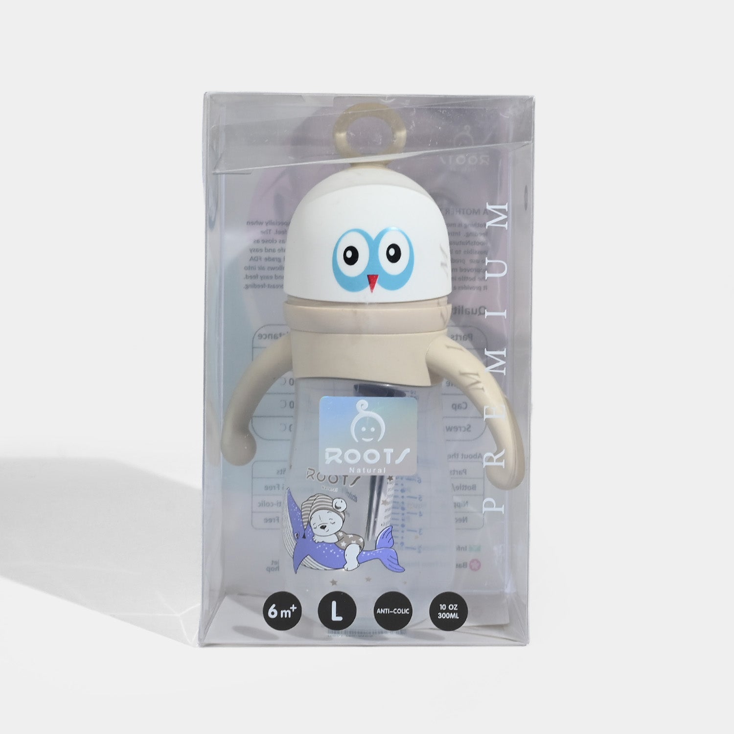 The ROOTS NATURAL Premium Quality Bottle is constructed with high-grade material that is 100% non-toxic for your baby. Along with a silicone nipple containing 0% “Voc” and an anti-colic air system, the bottle is adorned with googling eyes top cap.