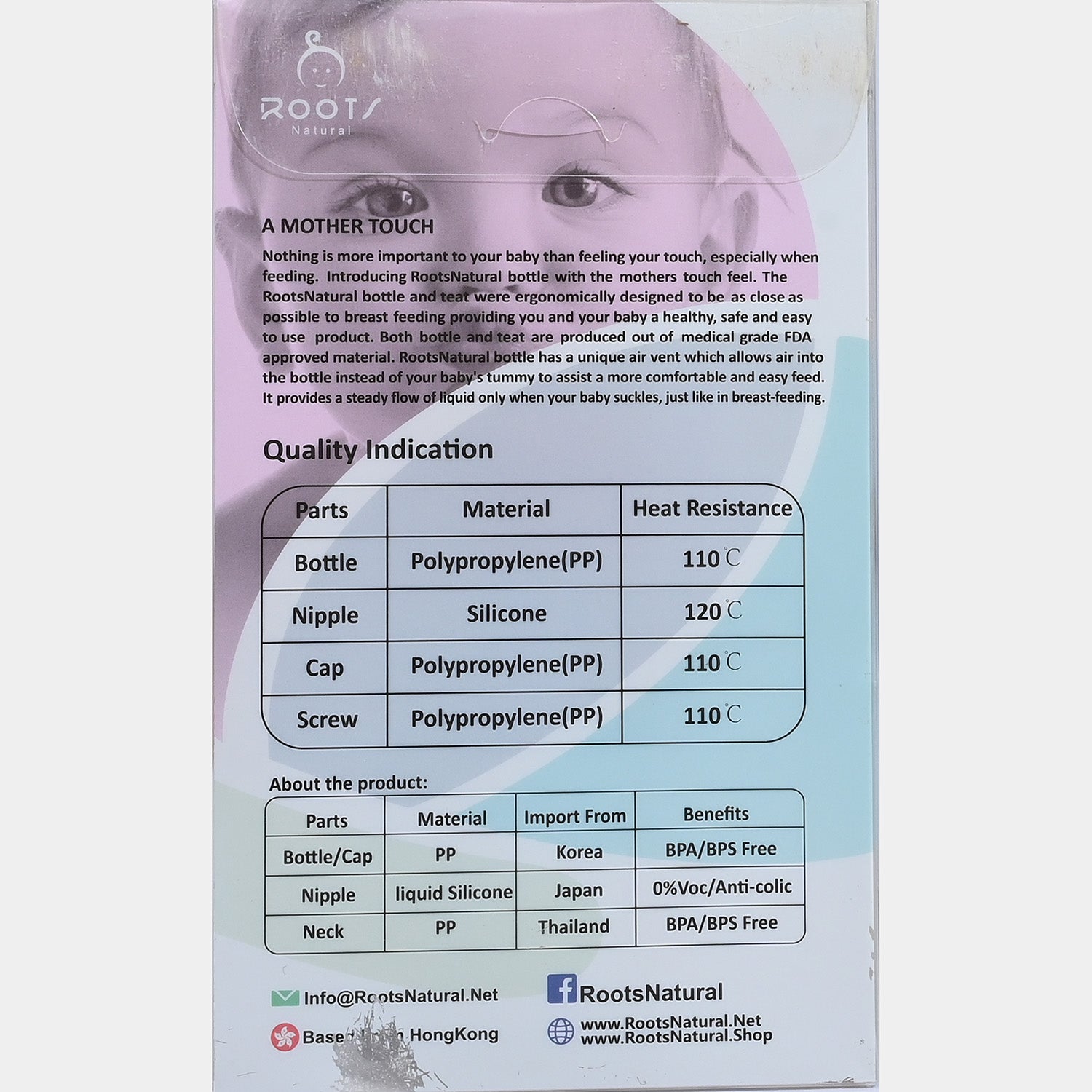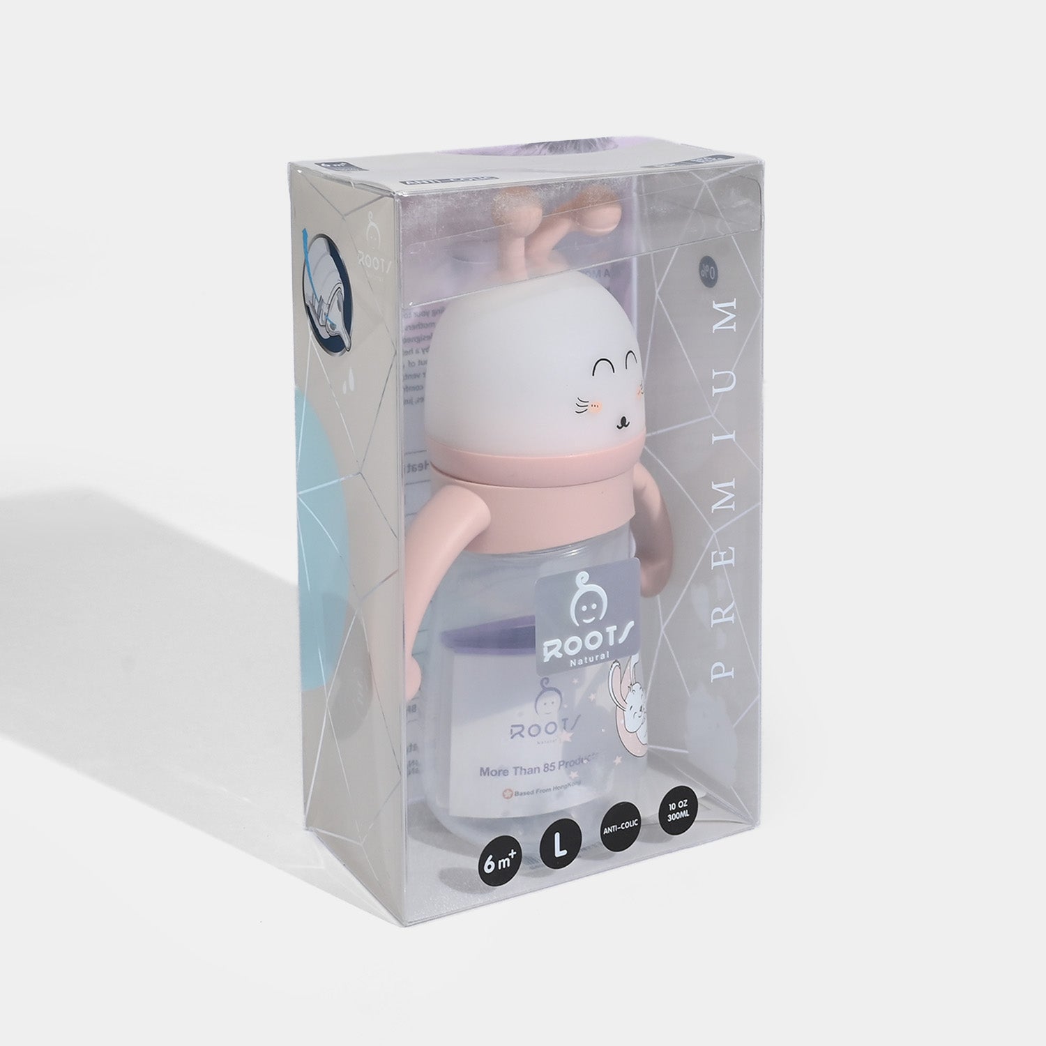 The ROOTS NATURAL Premium Quality Bottle is constructed with high-grade material that is 100% non-toxic for your baby. Along with a silicone nipple containing 0% “Voc” and an anti-colic air system, the bottle is adorned with a charming bunny shape top cap.