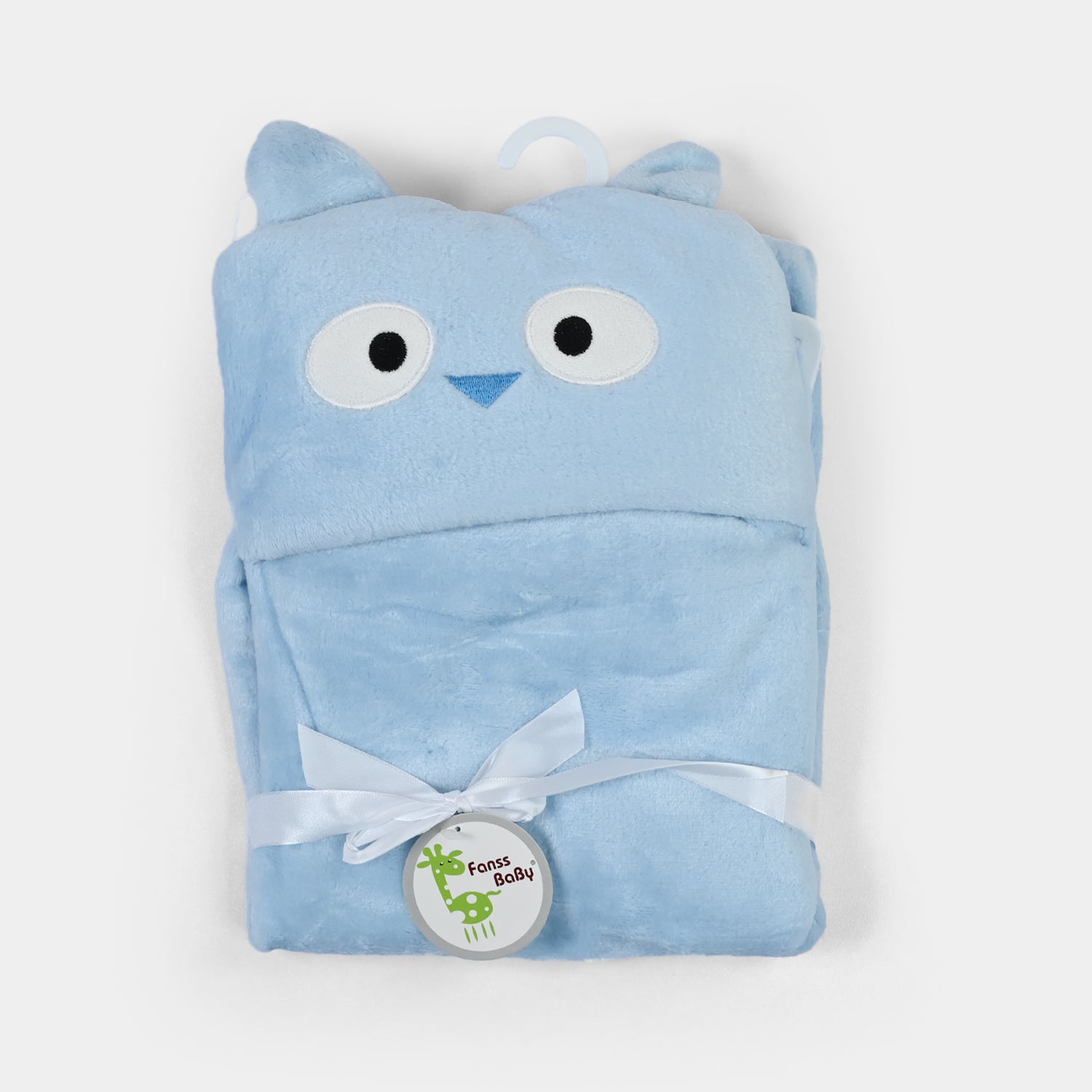 Owl-themed hooded baby blanket in blue, made from soft, cozy fabric to keep your little one warm and comfortable at home or on the go.